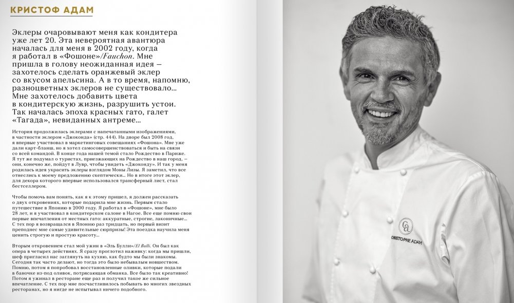 Этот объемный фолиант, посвященный эволюции (а, точнее сказать - "революции") классических французских пирожных из заварного теста, включает свыше 200 рецептов Кристофа Адама за прошедшие 20 лет. Сегодня многие рецепты этого знаменитого парижского шефа разошлись по кондитерским всего мира. И теперь мы считаем разнообразие эклеров как само собой разумеющееся. Но именно благодаря Кристофу Адаму это и произошло! Не зря журналисты, в свое время, окрестили шеф-кондитера "королем эклеров".