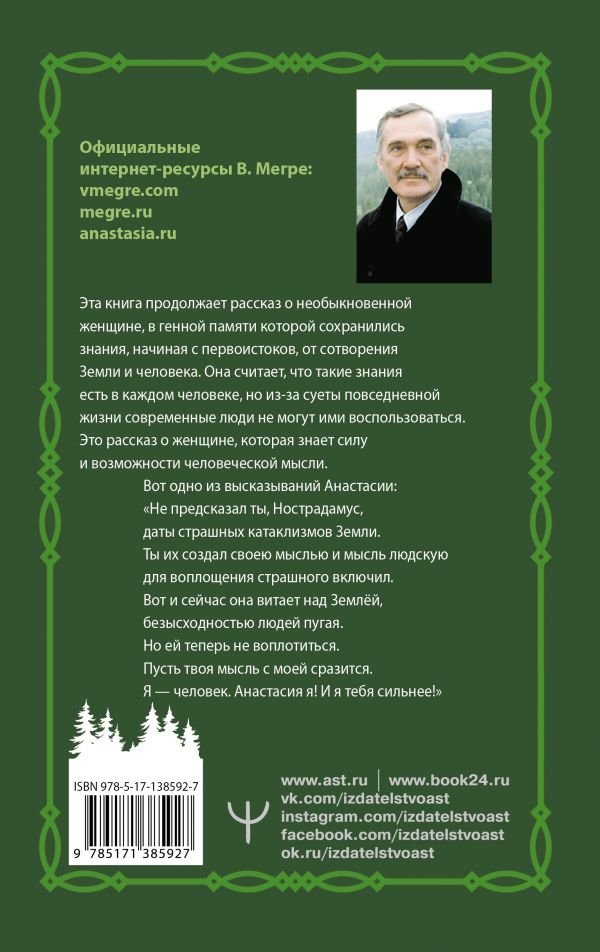 Эта книга продолжает рассказ о необыкновенной женщине, обладающей даром прародителей и знаниями первоистоков истины. «…Не предсказал ты, Нострадамус, даты страшных катаклизмов Земли. Ты их создал своею мыслью и мысль людскую для воплощения страшного включил. Вот и сейчас она витает над Землёй, безысходностью людей пугая. Но ей теперь не воплотиться. Я — человек. Анастасия я! И я тебя сильнее!»