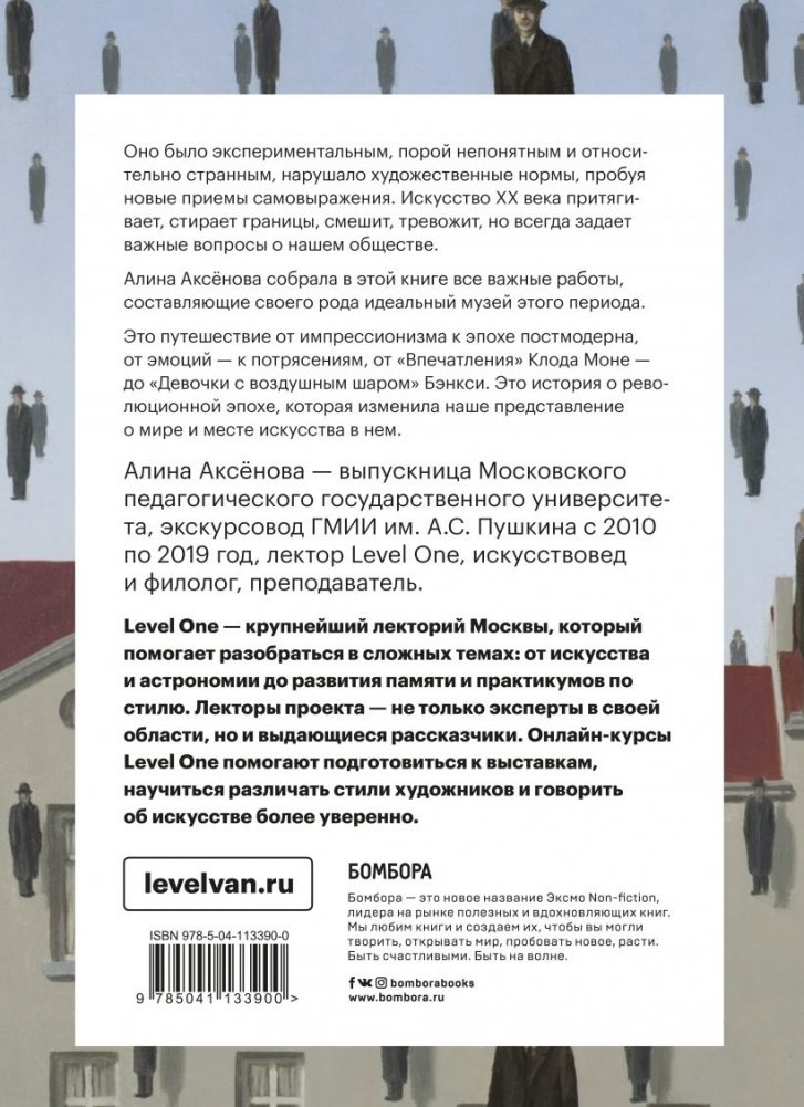 Вместо картин и скульптур — банки с супом, неубранная кровать и кошачий скелет, а слово «искусство» определялось и переопределялось так много раз за последние 100 лет, что обогатилось совершенно новыми социальными, политическими и техническими смыслами. От художников до произведений, от контекста до обстоятельств создания, Алина Аксёнова расскажет всё об искусстве XX века, понятным, но серьезным слогом. Эта богато иллюстрированная и исчерпывающая книга — настоящая находка среди множества по искусству этого периода. Она позволит вам освежить свои знания и заново открыть для себя шедевры богатого художественного наследия XX века. Это еще и прочная основа для всех учеников и студентов, готовящихся к экзаменам по истории искусств. А для тех, кто уже имеет твердые художественные ориентиры, это способ переформулировать свои знания, агрегировать их или просто пересмотреть. Level One — известный московский лекторий, чьи лекторы — эксперты в своих областях и замечательные рассказчики, они помогут вам быстро узнать главное в каждой теме. Автор этой книги — Алина Аксёнова, лектор Level One, искусствовед и филолог, в прошлом экскурсовод в ГМИИ им. А.С. Пушкина, специалист по культуре Древней Греции, автор бестселлера «История искусств. Просто о важном. Стили, направления и течения». Алина Аксёнова — выпускница Московского педагогического государственного университета, экскурсовод ГМИИ им. А.С. Пушкина с 2010 по 2019 год, лектор Level One, искусствовед и филолог, преподаватель и автор бестселлера «История искусства. Просто о важном. Стили, направления и течения».