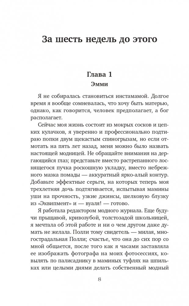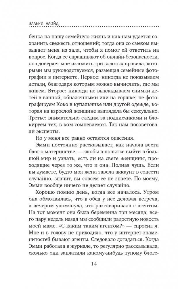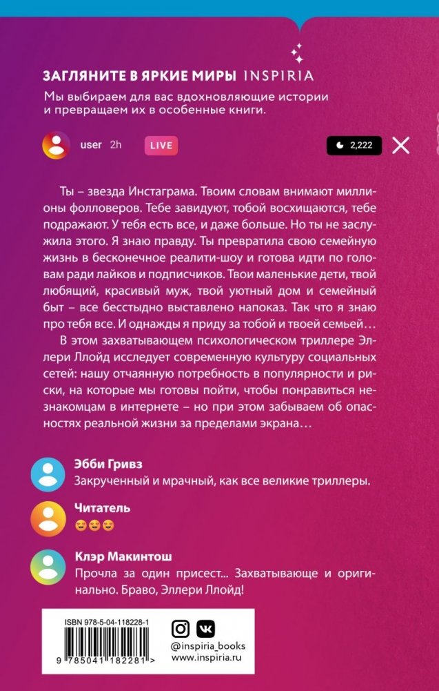 Её любят миллионы мамочек. И ненавидит одна… Ты — звезда Инстаграма. Твоим словам внимают миллионы фолловеров. Тебе завидуют, тобой восхищаются, тебе подражают. У тебя есть все и даже больше. Но ты не заслужила этого. Я знаю правду. Ты превратила свою семейную жизнь в бесконечное реалити-шоу и готова идти по головам ради лайков и подписчиков. Твои маленькие дети, твой любящий, красивый муж, твой уютный дом и семейный быт — всё бесстыдно выставлено напоказ. Так что я знаю про тебя всё. И однажды я приду за тобой и твоей семьей… В этом захватывающем психологическом триллере Эллери Ллойд исследует современную культуру социальных сетей: нашу отчаянную потребность в популярности и риски, на которые мы готовы пойти, чтобы понравиться незнакомцам в интернете - но при этом забываем об опасностях реальной жизни за пределами экрана… «Прочла за один присест... Захватывающе и оригинально. Браво, Эллери Ллойд!» — Клэр Макинтош «Социальные сети еще никогда не были такими мрачными и привлекательными. Волнующий взгляд на мир инфлюенсеров и то, как он влияет на их семьи». — Саманта Даунинг «Умный, оригинальный и увлекательный триллер с захватывающим набором реалистичных персонажей». — Дженни Кинтана «Идеальный современный триллер. Притягательная и одновременно отталкивающая главная героиня, изящное повествование от двух лиц, основанное на сценарии, который легко вообразить... Совершенно невозможно оторваться. Мне казалось, что каждая глава заканчивается на крутом моменте, и мое сердце уходило в пятки. Мне понравилось». — Кэролайн Коркоран «Не читайте эту книгу в поезде — я пропустила свою остановку... С одной стороны, это увлекательный и остроумный page-turner. С другой стороны — книга, которая заставит вас по-другому взглянуть на жизнь в двадцать первом веке». — Холли Уотт Захватывающий, заставляющий задуматься, продуманный до мельчайших деталей роман. Я подозревала всех по очереди... Поистине блестящее и освежающе оригинальное произведение». — Карен Гамильтон «Закрученный и мрачный, как все большие триллеры». — Эбби Гривз