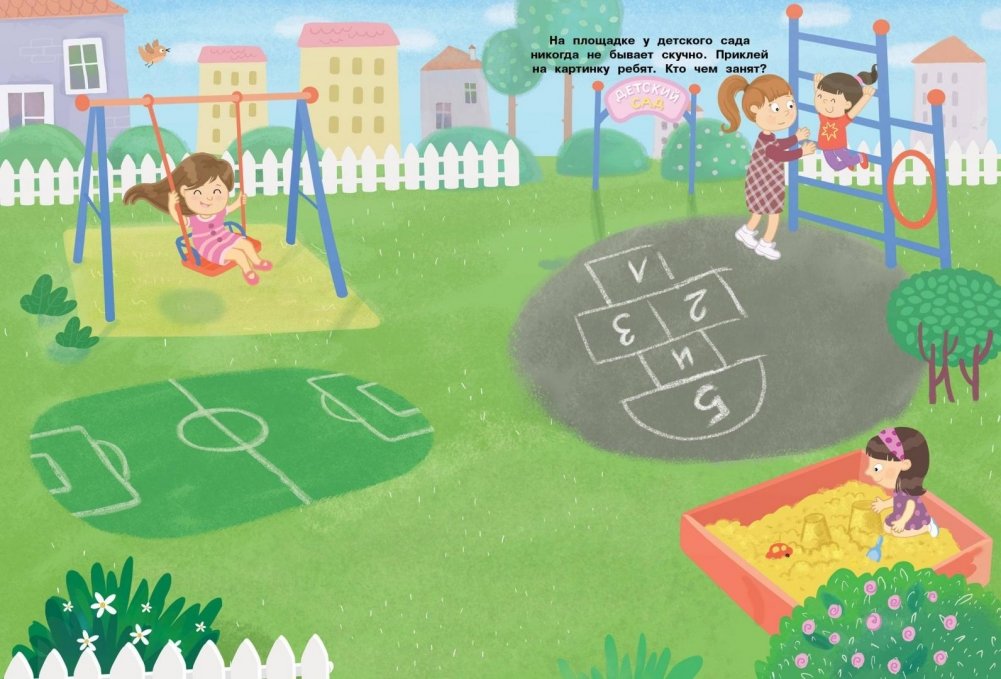 В нашем детском садике просто некогда скучать! Здесь так много игрушек - можно играть и в группе, и на площадке на улице! На занятиях можно научиться рисовать, выучить буквы и подготовиться к школе. И конечно тут много друзей! Приходи и ты в наш детский сад. Приклеивай игрушки и ребятишек, придумывай разные истории. Наши наклейки многоразовые, поэтому можно фантазировать сколько угодно и приклеивать картинки снова и снова!