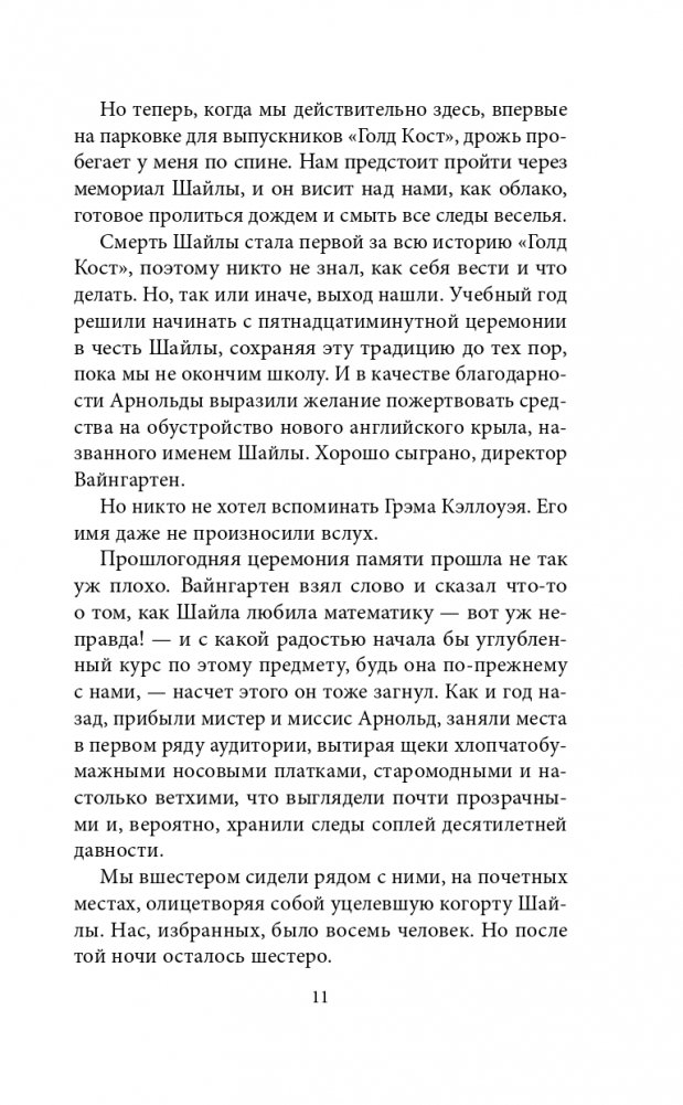Говорят, что только святые умирают молодыми. Но Джилл Ньюман точно знает: это всего лишь строчка из глупой песни. У Джилл нет дорогой машины, она не носит дизайнерские вещи и не загорает на лучших пляжах Лонг-Айленда. Только благодаря упорному труду девушка смогла получить стипендию и поступить в "Голд Кост", самую престижную школу страны. Здесь все выглядит идеально, но что на самом деле скрывается за красивым фасадом этой школы? Ее лучшая подруга, ослепительная и талантливая Шайла, была убита своим бойфрендом Грэмом. Он во всем сознался, и дело было закрыто. Но когда начался последний учебный год, Джилл неожиданно получила несколько сообщений о невиновности Грэма. Тогда кто убил Шайлу Арнольд?