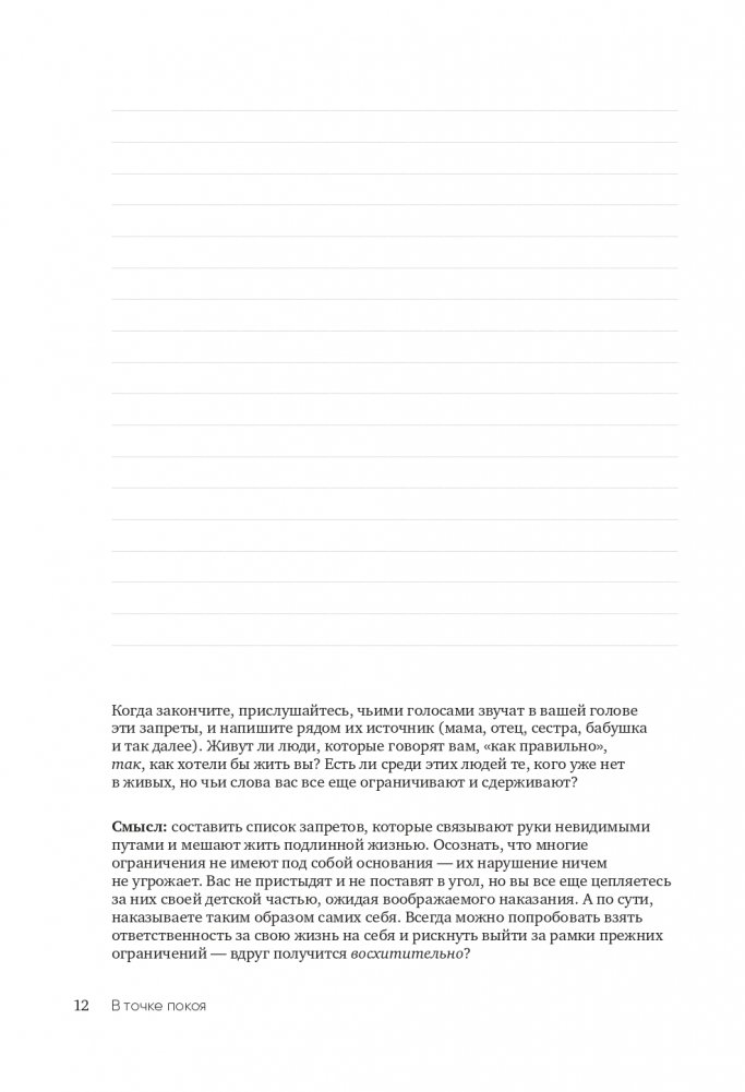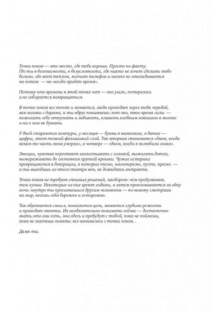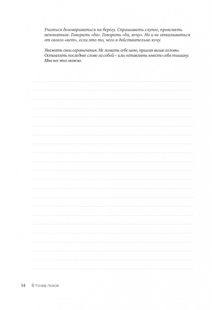 Ольга Примаченко — журналист, психолог и автор "К себе нежно", книги-феномена, которая помогла тысячам женщин понять, принять и полюбить себя. "В точке покоя" — это авторский воркбук из 55 упражнений для знакомства с собой, поиска ресурса и вдохновения. Рабочий инструмент, который поможет прийти в свою "точку покоя" и обрести гармонию и целостность. Тетрадь-путешествие к себе, полное приключений и открытий. Все, что вы узнаете о себе здесь, станет вашим несгораемым ресурсом — важным знанием о себе, с которым проще и понятнее жить.