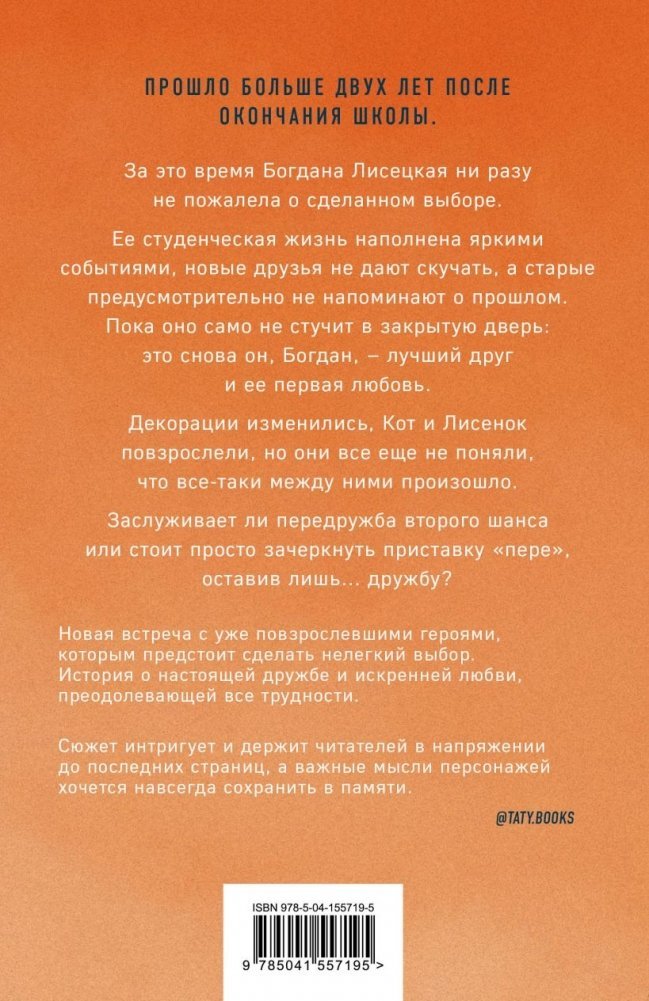 Прошло больше двух лет после окончания школы. За это время Богдана Лисецкая ни разу не пожалела о сделанном выборе. Ее студенческая жизнь наполнена яркими событиями, новые друзья не дают скучать, а старые предусмотрительно не напоминают о прошлом. Пока оно само не стучит в закрытую дверь: это снова он, Богдан — лучший друг и ее первая любовь. Декорации изменились, Кот и Лисенок повзрослели, но они все еще не поняли, что все-таки между ними произошло? Заслуживает ли передружба второго шанса или стоит просто зачеркнуть приставку пере-, оставив лишь... дружбу?