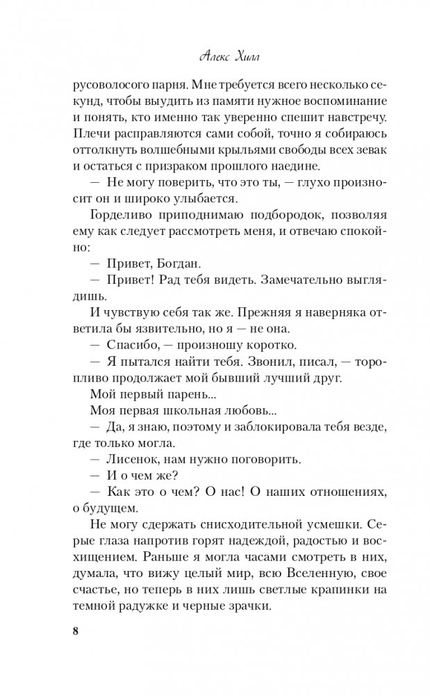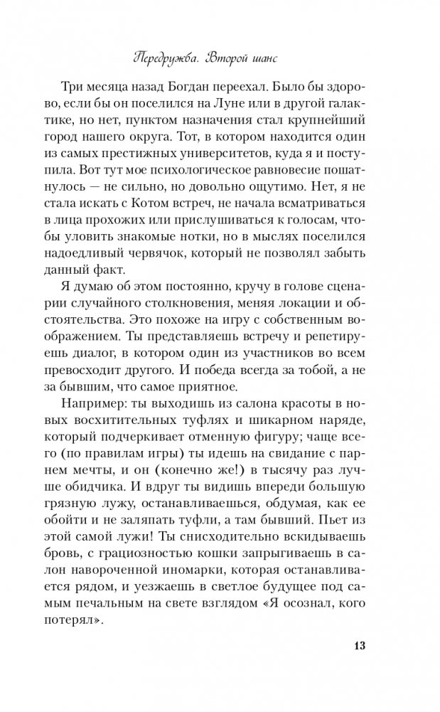 Прошло больше двух лет после окончания школы. За это время Богдана Лисецкая ни разу не пожалела о сделанном выборе. Ее студенческая жизнь наполнена яркими событиями, новые друзья не дают скучать, а старые предусмотрительно не напоминают о прошлом. Пока оно само не стучит в закрытую дверь: это снова он, Богдан — лучший друг и ее первая любовь. Декорации изменились, Кот и Лисенок повзрослели, но они все еще не поняли, что все-таки между ними произошло? Заслуживает ли передружба второго шанса или стоит просто зачеркнуть приставку пере-, оставив лишь... дружбу? Продолжение полюбившейся читателям истории от автора бестселлера «Передружба. Недоотношения» Алекс Хилл! Кот и Лисенок повзрослели, их пути разошлись, они больше не школьные друзья, не пара, у каждого своя жизнь. Внезапная встреча рушит все планы, вскрывает старые раны, чувства вспыхивают с новой силой. Но Богдана Лисецкая не намерена повторять историю. Она хочет идти дальше, не оглядываясь назад. Вот только удастся ли ей это, когда она вновь увидит знакомые серые глаза? Узнаваемое серийное оформление, фирменный авторский слог и неожиданные сюжетные повороты! Героям снова предстоит сделать непростой выбор, остаться собой и не потерять любимых. Эта книга — чудесный подарок для поклонников Аси Лавринович и Лены Сокол!