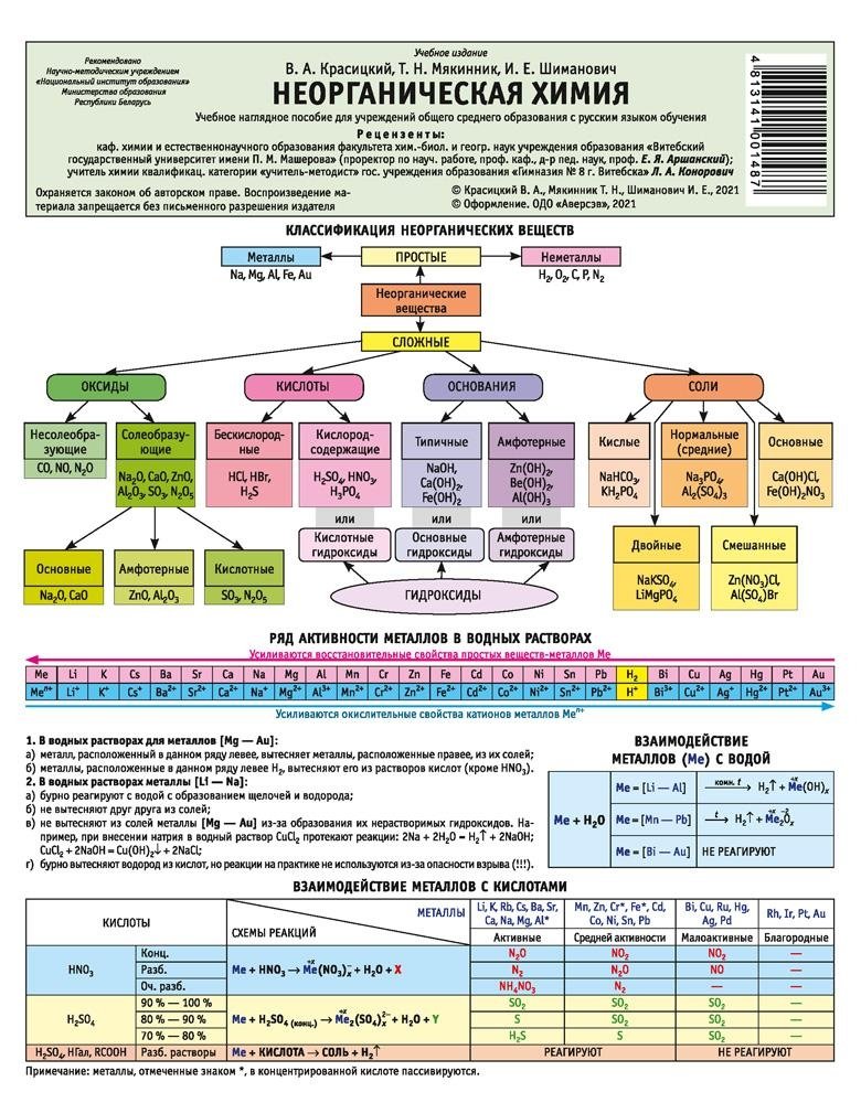 Буклет составлен на основе учебной программы для учреждений общего среднего образования. В нем содержится тщательно отобранный и детально систематизированный материал, являющийся основой для успешного изучения школьного курса химии; представлен в виде оригинальных подробных схем и таблиц с текстовыми и графическими пояснениями и многочисленными примерами уравнений реакций. Данное пособие будет содействовать запоминанию основной терминологии, пониманию существенных признаков различных понятий, усвоению фактического материала, обобщению знаний; является незаменимым дополнением к школьным учебникам и может быть использован при изучении школьного курса химии на базовом, профильном и углубленном уровнях, для систематизации знаний при подготовке к олимпиадам по химии, экзаменам и к централизованному тестированию.