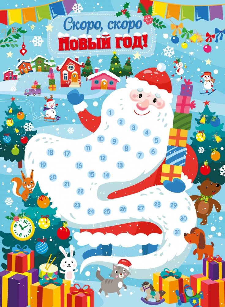 Повесьте плакат на стену. Весь декабрь ежедневно наклеивайте на бороду Деда Мороза кружочки - по одному на соответствующую дату, но только после того, как ребенок выполнит задание! Ну что, поиграем?
