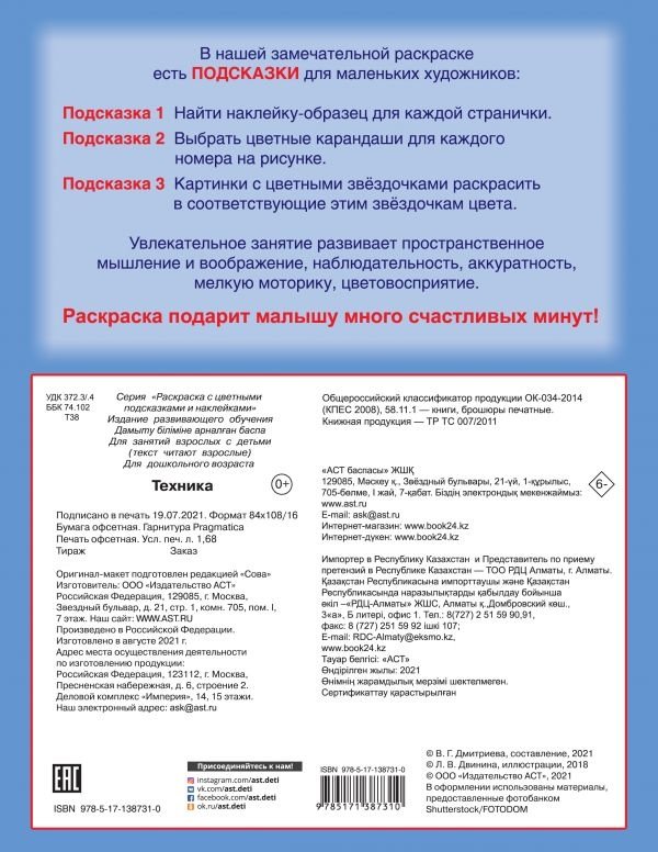 «Техника» — раскраска для тех, кто любит рисовать, раскрашивать, узнавать новое о мире автомобильной техники. Малыши смогут для каждой странички подобрать наклейки-машинки и аккуратно раскрасить картинки по образцу. Увлекательное занятие развивает воображение, память и внимание, способствует развитию речи, зрительного восприятия, мелкой моторики, пространственного мышления, координации движений, творческого воображения.