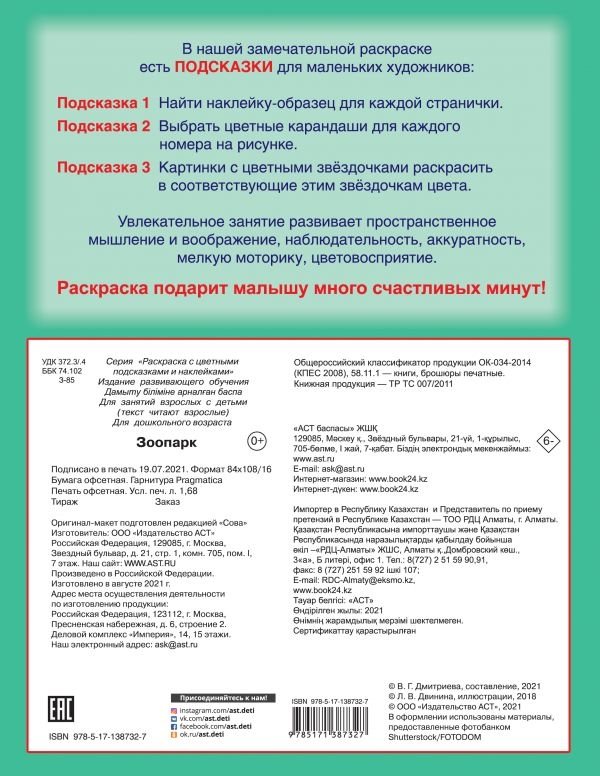 «Зоопарк» — раскраска для тех, кто любит рисовать, раскрашивать, узнавать новое о мире животных. Малыши смогут для каждой странички подобрать наклейки диких животных и аккуратно раскрасить картинки по образцу. Увлекательное занятие развивает воображение, цветовосприятие, мелкую моторику, логическое и абстрактное мышление, формирует усидчивость и умение доводить до конца начатое.