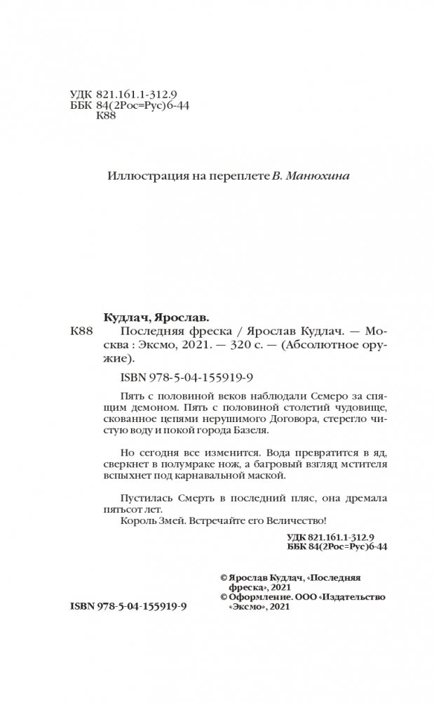 Мистический триллер о пробуждении василиска, легендарного хранителя Базеля. Автор — лауреат литературной премии Северный клинок / Nordklinge, 2019 г. Пять с половиной веков наблюдали Семеро за спящим демоном. Пять с половиной столетий чудовище, скованное цепями нерушимого Договора, стерегло чистую воду и покой города Базеля. Но сегодня все изменится. Вода превратится в яд, сверкнет в полумраке нож, а багровый взгляд мстителя вспыхнет под карнавальной маской. Пустилась Смерть в последний пляс, она дремала пятьсот лет. Король Змей. Встречайте его Величество!