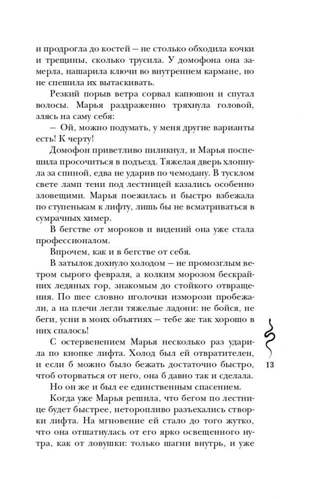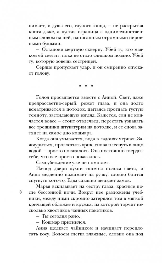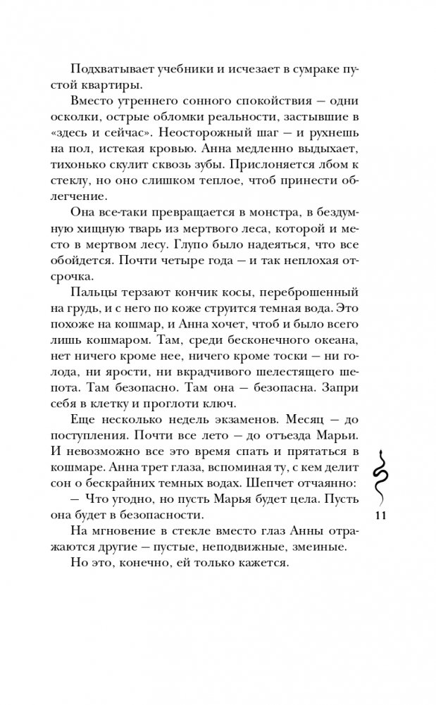 Не верьте, что сказки заканчиваются по-доброму. Они обращаются мраком. Даже спустя несколько лет после возвращения из Нави, сестры замечают странные тени и белые глаза в толпе. Марья прячется от самой себя в ледяной сон, в Анне все меньше остается от человека. А сквозь расколотое небо в мир живых тянется Навь. И когда Марья находит вместо сестры древнюю хтонь в ее теле, все, что ей остается — звать на помощь свой самый большой кошмар. И идти вслед за змеями — в надежде еще хоть что-то исправить.