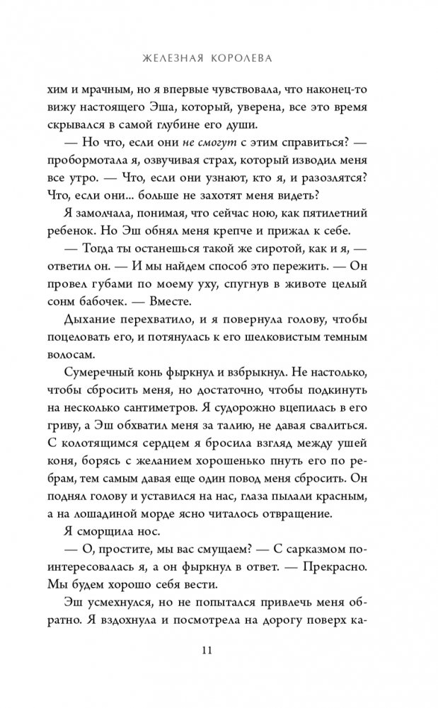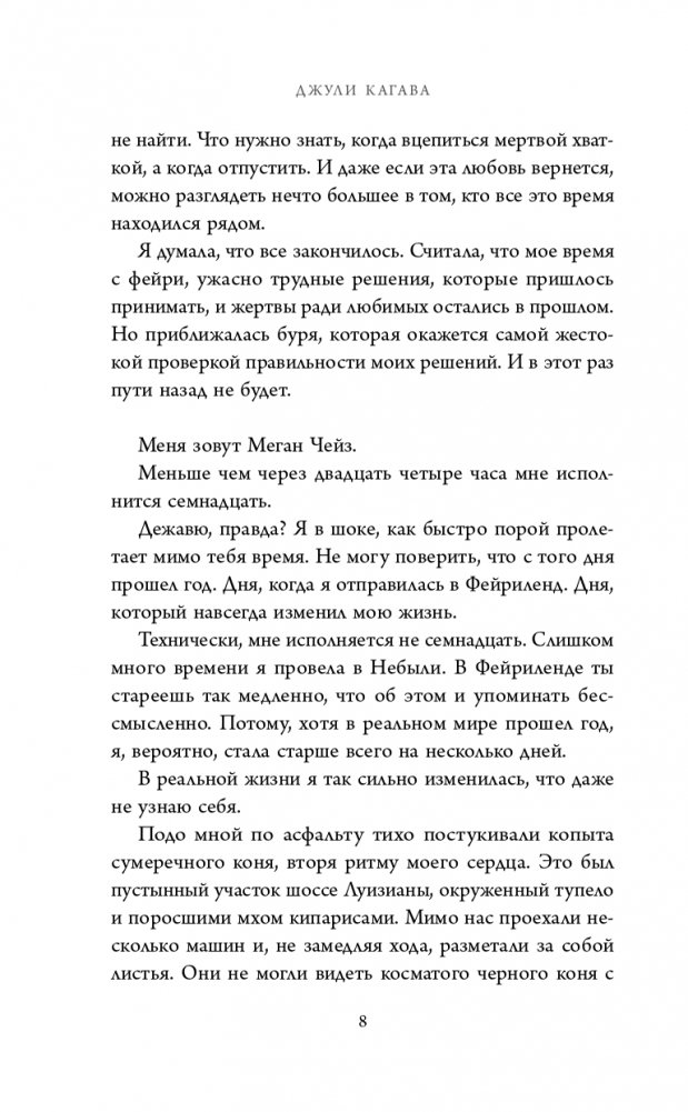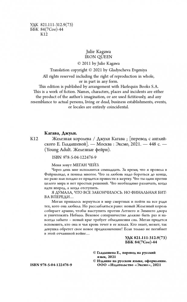 Меня зовут МЕГАН ЧЕЙЗ. Через день мне исполнится семнадцать. За время, что я провела в Фейриленде, я поняла многое. Что за любовь надо бороться до конца, но рано или поздно ее придется принести в жертву. Что ты один против целого мира и нет простых решений. Что необходимо различать, когда идти вперед, а когда отступить. Я ДУМАЛА, ЧТО ВСЕ ЗАКОНЧИЛОСЬ. НО ФИНАЛЬНАЯ БИТВА ВПЕРЕДИ… Меган пришлось вернуться в мир смертных и пойти на все ради тех, кого она любила. Но расслабляться рано: новый Железный король собирает армию, чтобы выступить против Летнего и Зимнего двора и уничтожить Небыль. Вековое соперничество должно быть раз и навсегда забыто — новый враг требует объединения сил. Меган придется вспомнить, кто она и чья кровь течет в ее жилах. Кто знает, может, так девушка обретет свое новое предназначение! Если только не погибнет в этой отчаянной войне… Третья часть одного из лучших циклов про фейри! О злых, коварных созданиях и девушке, вынужденной играть по их правилам. Меган после изгнания вновь возвращается в Фейриленд, чтобы осуществить условия сделки и уничтожить железного Лжекороля. Летним и Зимним фейри придется забыть о разногласиях, вся Небыль под угрозой исчезновения! Кагава проработала мир до мелочей: Небыль разделена на три царства. Аркадия — Летний двор, Тир-на-ног — Зимний двор и Железное королевство. Последним правит железный фейри — ужас технологического прогресса, который нереально уничтожить. Не забывайте: войны между фейри, а также обмен Скипетром времен года, влияют на погоду и эмоциональный климат всего человечества. А уж какую сильную и коварную любовь вы встретите в Фейриленде! Меган не могла поверить, что ее возлюбленный Эш так жестоко обошелся с ней. Но теперь он другой: прямолинеен, нежен и учтив. Надолго ли? «Я могу прочитать эту книгу тысячу раз и никогда не устану от нее. Это одна из моих самых любимых книг во всей серии. Магическая сказка, наполненная непредсказуемостью, решимостью, судьбоносностью, любовью и потерями». — Amazon.com Риск, мощный экшен, подковерные игры, любовь, страсть, жестокость, ответственность за собственные решения, месть, кровь, самопожертвование — в этой серии все, что составляет основу эпичного фэнтези. Серия выходит в оригинальных обложках с закрашенными обрезами!