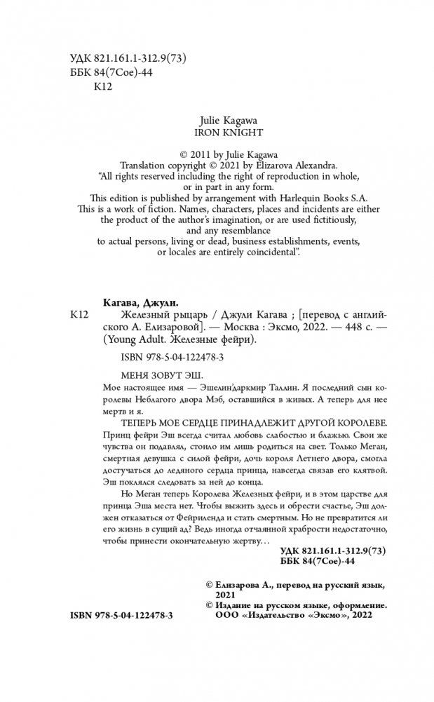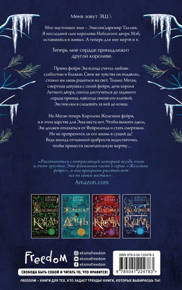 МЕНЯ ЗОВУТ ЭШ. Мое настоящее имя — Эшелин'даркмир Таллин. Я последний сын королевы Неблагого двора Мэб, оставшийся в живых. А теперь для нее мертв и я. Принц фейри Эш всегда считал любовь слабостью и блажью. Свои же чувства он подавлял, стоило им лишь родиться на свет. Только Меган, смертная девушка с силой фейри, дочь короля Летнего двора, смогла достучаться до ледяного сердца принца, навсегда связав его клятвой быть ее рыцарем. Эш поклялся следовать за ней до конца. ТЕПЕРЬ МОЕ СЕРДЦЕ ПРИНАДЛЕЖИТ ДРУГОЙ КОРОЛЕВЕ. Но Меган теперь Королева Железных фейри, и в этом царстве для принца Эша места нет. Чтобы выжить здесь и обрести счастье, Эш должен отказаться от Фейриленда и стать смертным. Но не окажется ли цена непомерной? Ради обретения души Эшу придется пойти на огромный риск, познав самый настоящий ад. Ведь иногда отчаянной храбрости недостаточно, чтобы принести окончательную жертву… Заключительная часть одного из лучших циклов про фейри! Эта история рассказана от лица Эша — невероятно притягательного темного фейри, связанного с Меган клятвой и безусловным чувством любви. Пойдет ли он на огромные жертвы, чтобы получить человеческую душу и вернуться в Железное королевство к возлюбленной? Какие тайны хранит в себе путь к человеческой душе? Так ли просто быть человеком и испытывать весь спектр людских эмоций, нести ответственность за свои поступки? Эш столкнется с самыми сложными испытаниями, которые могли выпасть на его долю. Но ведь истинная любовь к новоиспеченной Железной королеве того стоит, не так ли? Вы увидите Эша совсем другим. Он уже не тот неуязвимый неблагой фейри. Он — такой же, как и все мы. Со своими сожалениями, разочарованиями в самом себе. Он ничего не принимает на веру, всегда сомневается: а верным ли будет для него тот или иной выбор? Потрясающе честное и реалистичное погружение в его личность, характер, наполненное сюрпризами и откровениями. «Я искренне благодарна Джули за то, что она продолжила серию и создала еще одно удивительное приключение. Эш всегда был моим любимым персонажем, я полюбила его с самого начала, и сейчас, после прочтения, влюбилась в него еще сильнее». — Amazon.com Риск, мощный экшен, подковерные игры, любовь, страсть, жестокость, ответственность за собственные решения, месть, кровь, самопожертвование — в этой серии все, что составляет основу эпичного фэнтези.