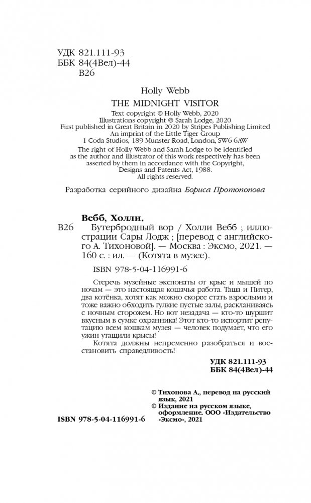 Котёнок Питер только-только попал в музей и очень хочет найти друзей. Но как заводят друзей? Что для этого нужно сделать? Совершить подвиг? Но всё оказывается гораздо проще — например, пойти охотиться на крысу-воришку и поймать скелет тираннозавра, а потом вместе с новыми друзьями торопливо его собирать, ведь скоро рассвет, а днём в музее полно людей! Холли Вебб — популярная во всём мире писательница, но особенно её полюбили в России. Истории Холли Вебб мудро и ненавязчиво учат дружбе, умению отвечать за свои поступки и ладить с другими. Чтобы юный читатель не уставал, в книге используется крупный шрифт. А очаровательные иллюстрации позволят переключать внимание, не отвлекаясь от интересной истории. На эту серию Холли Вебб вдохновило посещение Эрмитажа — и рассказы об эрмитажных котах!