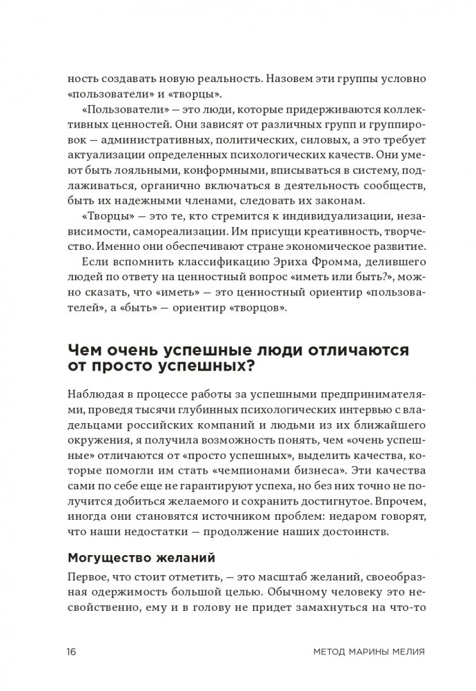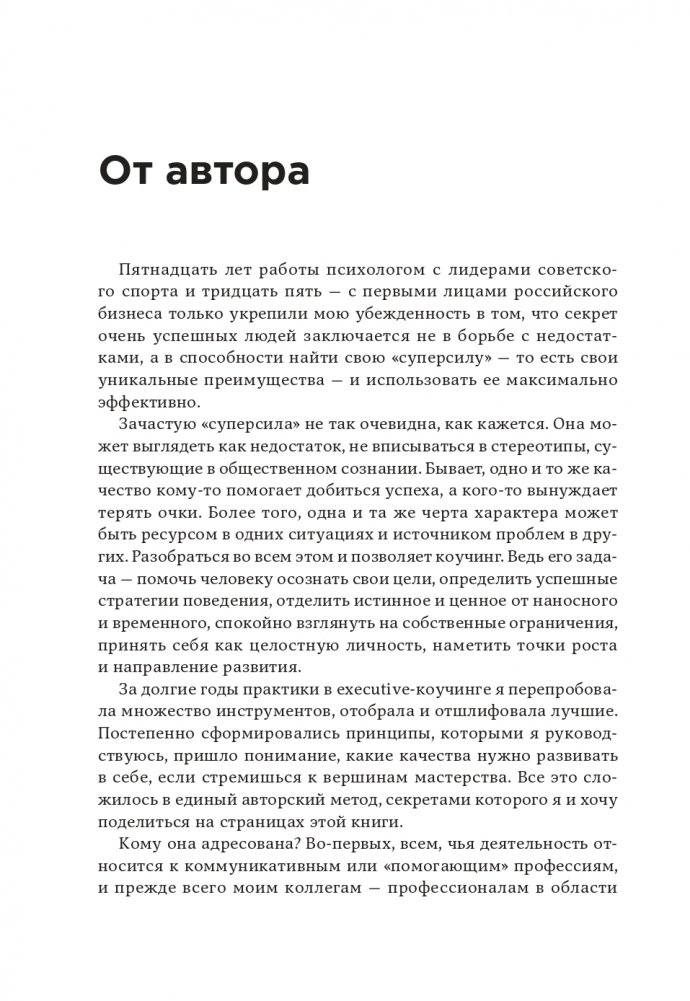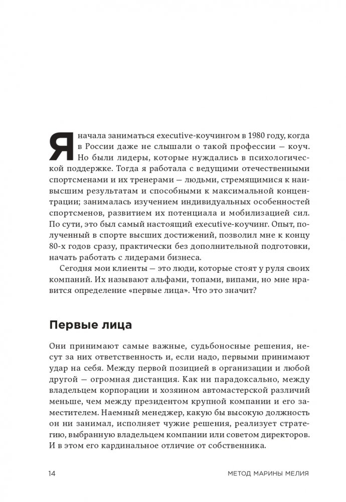 В основе метода Марины Мелия – глубокая вера в возможности и скрытые силы, заложенные в каждом человеке. Зачастую "сила" не очевидна: она может выглядеть как недостаток или не вписываться в стереотипы. Бывает, одно и то же качество кому-то помогает добиться успеха, а кого-то вынуждает терять очки. Одна и та же черта характера может быть ресурсом в одних ситуациях и источником проблем в других. Разобраться во всем этом, осознать свои цели, определить успешные стратегии поведения, отделить истинное и ценное от наносного и временного, спокойно взглянуть на собственные ограничения, принять себя как целостную личность, наметить точки роста и направления развития позволяет коучинг. Автор приглашает читателя в свою "мастерскую" и делится профессиональными секретами.