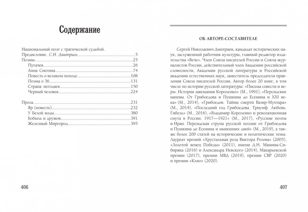 В основу книги избранных произведений великого русского поэта Сергея Есенина (1895-1925) легло "Собрание сочинений в 3-х томах", которое он сам составил в 1925 г. и которое ему так и не суждено было увидеть выпущенным в свет. Включенные в книгу поэмы "Пугачев", "Анна Снегина", "Повесть о великом походе", "Поэма о 36", "Страна негодяев" и "Черный человек" - вершина поэтического творчества "певца русской деревни", без которых нельзя представить историю отечественной поэзии XX века. Однако одной поэзией не ограничивается творческое наследие Сергея Есенина, предпринимавшего удачные попытки прозаических исканий. Помещенные в книге произведения "Яр", "У Белой воды", "Бобыль и дружок" и "Железный Миргород" показывают, какой потенциал еще мог бы использовать автор, если бы ему не суждено было "уйти в историю" в результате трагедии в "Англетере".