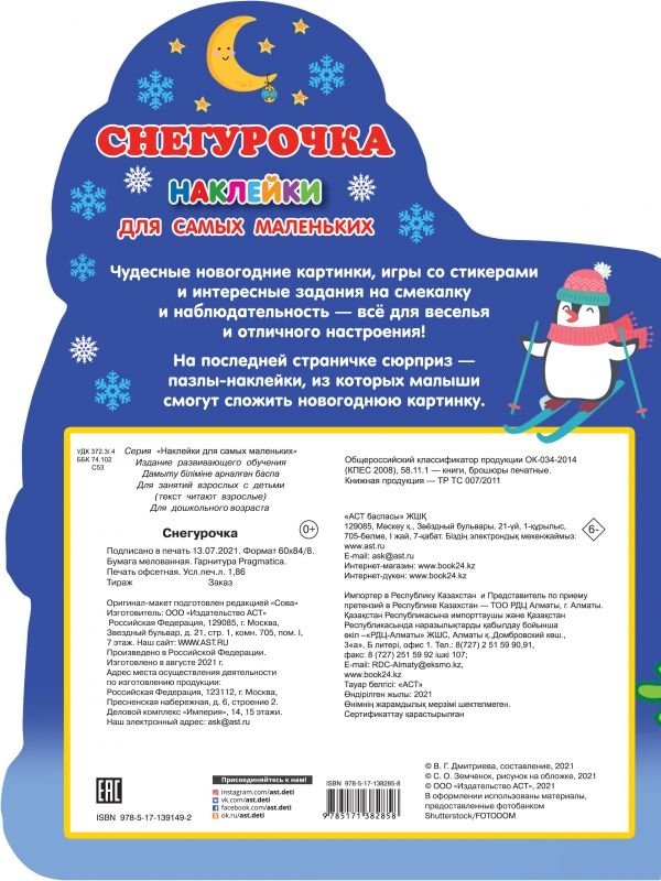 «Снегурочка» — замечательная цветная книжка с фигурной вырубкой. Это красочные иллюстрации + развивающие задания + коллекция новогодних стикеров. На страницах книжки малыши окажутся в гостях у Снегурочки, и все вместе отправятся на новогодний карнавал. А на последней странице бонус — пазлы-наклейки, из которых малыш сложит картинку.