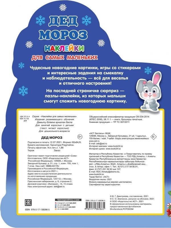 «Дед Мороз» — замечательная цветная книжка с фигурной вырубкой. Это красочные иллюстрации + развивающие задания + коллекция новогодних стикеров. На страницах книжки малыши окажутся в гостях у Дедушки Мороза и все вместе отправятся к волшебной ёлочке. А на последней странице бонус — пазлы-наклейки, из которых малыш сложит картинку.
