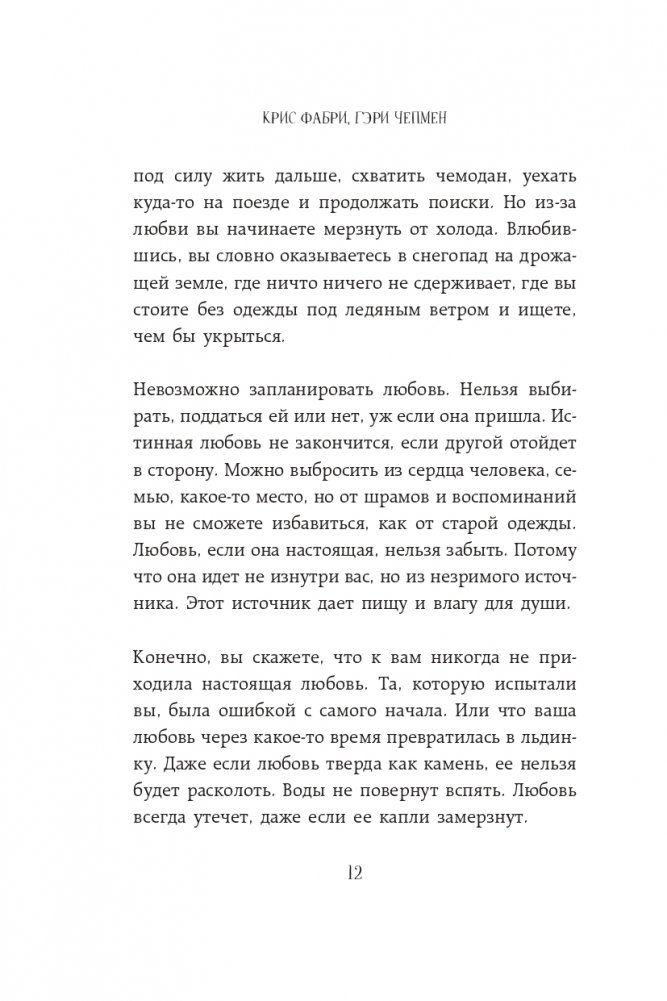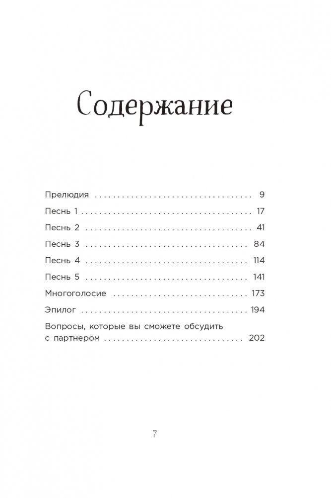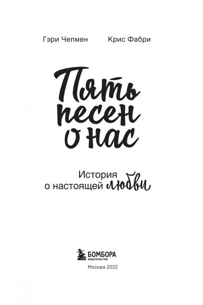 «Пять песен о нас» – романтическая новелла от одного из известнейших экспертов по отношениям Гэри Чепмена, автора легендарного бестселлера «Пять языков любви». Книга подарит вам не только красивую историю о любви, но и несколько уроков по психологии отношений. Марли и Джейкоб поженились в канун Рождества. Теперь, спустя 20 лет, в сочельник они решили развестись. Марли убеждена, что вышла не за того мужчину, Джейкоб устал от того, что его контролируют. Они спят в разных комнатах и, кажется, больше не готовы спасать свой брак. Их отношения покрыты снегом и льдом, как дорога, по которой они зимним вечером спешат к юристу — для того, чтобы поставить точку. Раз и навсегда. Пытаясь срезать путь, они попадают в снежный занос. Марли приходит в себя и, замерзшая, пытаясь отыскать своего мужа, находит дом. Здесь, в теплом и гостеприимном месте она столкнется с призраками прошлого, настоящего и потенциального будущего их брака — с тем, как их выбор влиял и еще может повлиять на судьбу их семьи. Это Рождество преподнесет им неожиданный подарок и поможет ответить на вопрос: они ли судьба друг друга или для того, чтобы счастье вернулось, близкого человека нужно отпустить? ОТЗЫВ: «Иногда резкий занос или падение необходимы для того, чтобы понять: не всегда мы можем получить ту любовь, которую жаждем. Особенно если не будем готовы идти на компромисс и "проживать" отношения, по-настоящему, день за днем. "Пять песен о нас" — это ода тем, кто отказывается сдаваться ради настоящей любви. Отличный микс магии и надежды». — Eva.ru