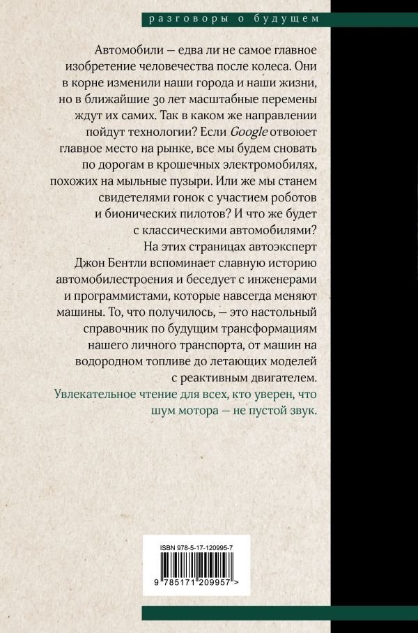 На этих страницах автоэксперт Джон Бентли вспоминает славную историю автостроения и беседует с инженерами и программистами, которые навсегда меняют машины. То, что получилось, — это настольный справочник по будущим трансформациям нашего личного транспорта, от машин на водородном топливе до летающих моделей с реактивным двигателем.