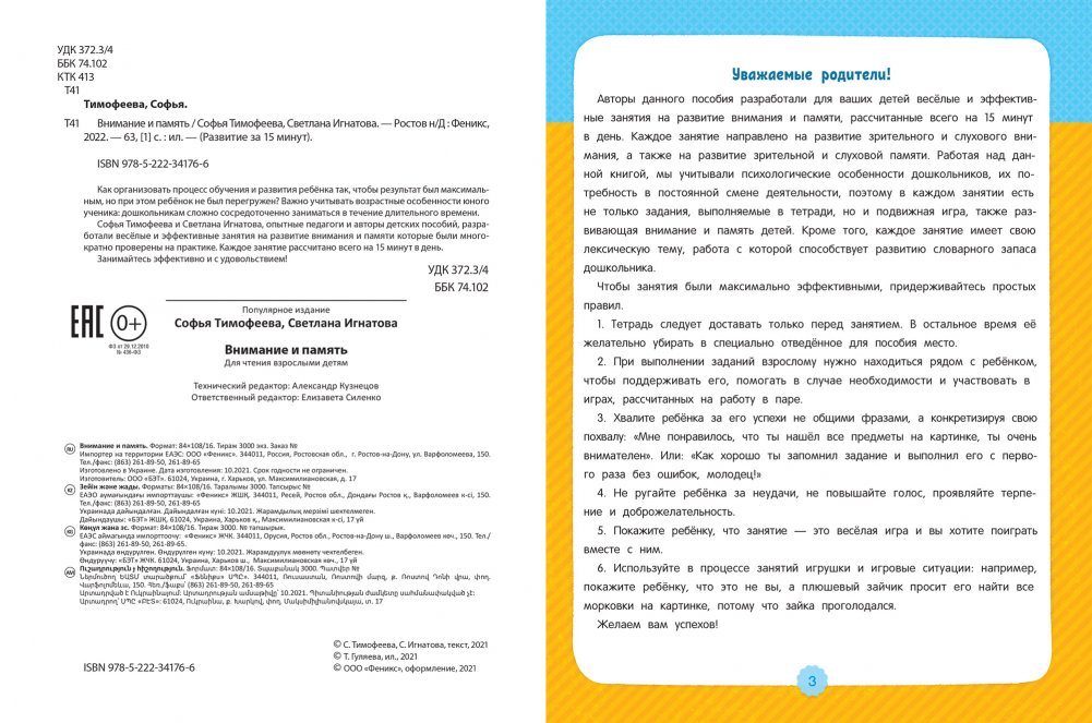 Софья Тимофеева и Светлана Игнатова, опытные педагоги и авторы детских пособий, разработали весёлые и эффективные занятия на развитие внимания и памяти которые были многократно проверены на практике. Каждое занятие рассчитано всего на 15 минут в день.