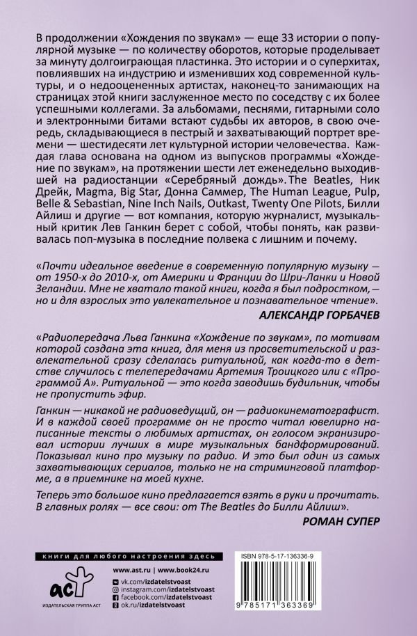 Продолжение одной из лучшей книг на русском языке о популярной музыке – Хождение по звукам 2.0. В продолжении "Хождения по звукам" еще 33 истории о популярной музыке — по количеству оборотов, которые проделывает за минуту долгоиграющая пластинка. Это истории и о суперхитах, повлиявших на индустрию и изменивших ход современной культуры, и о недооцененных артистах, наконец-то занимающих на страницах этой книги заслуженное место по соседству с их более успешными коллегами. За альбомами, песнями, гитарными соло и электронными битами встают судьбы их авторов, в свою очередь, складывающиеся в пестрый и захватывающий портрет времени — шестидесяти лет культурной истории человечества. Каждая глава основана на одном из выпусков программы «Хождение по звукам», на протяжении шести лет еженедельно выходившей на радиостанции «Серебряный дождь». The Beatles, Ник Дрейк, Magma, Big Star, Донна Саммер, The Human League, Pulp, Belle & Sebastian, Nine Inch Nails, Outkast, Twenty One Pilots, Билли Айлиш и другие — вот компания, которую журналист, музыкальный критик Лев Ганкин берет с собой, чтобы понять, как развивалась поп-музыка в последние полвека с лишним и почему.