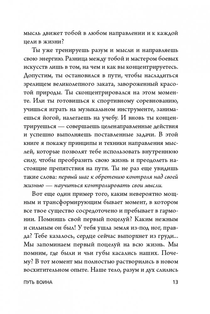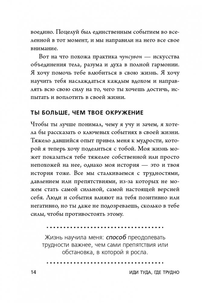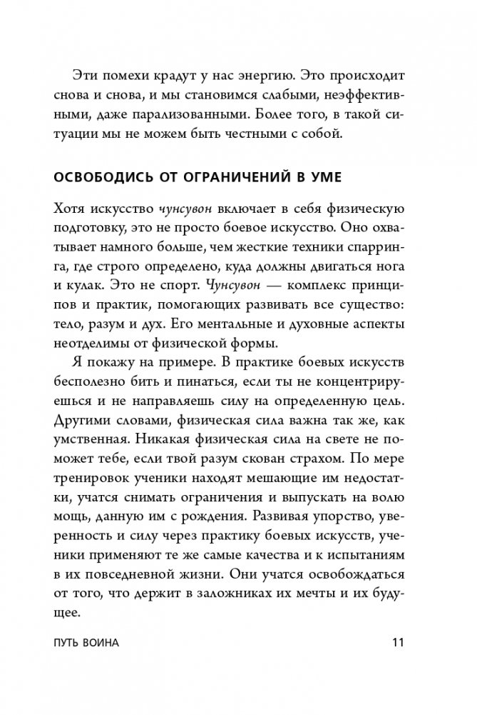 Когда разум захламлён суетой, тревогой и плохими мыслями — наша энергия рассеивается. Это происходит снова и снова, и мы становимся слабыми и неэффективными. Более того, в такой ситуации мы не можем быть честными с собой. Цель искусства Чунсувон — дать практические инструменты, благодаря которым вы сможете освободиться от ограничивающих, пагубных состояний ума, взглянуть на себя с разных сторон и пробудить свой невероятный потенциал к созданию жизни. Цитаты «ХРАНИ ВЕРНОСТЬ СВОИМ ЦЕЛЯМ, ОСОБЕННО КОГДА ВСЕ КАЖЕТСЯ БЕЗНАДЕЖНЫМ». «МЫ МОЖЕМ МНОГОМУ НАУЧИТЬСЯ У ПРИРОДЫ, ВНИМАТЕЛЬНО НАБЛЮДАЯ ЗА ЕЕ КРАСОТОЙ И СИЛОЙ». «НАМ ТАК ЧАСТО ХОЧЕТСЯ СДАТЬСЯ ВСЕГО В ОДНОМ ШАГЕ ДО УСПЕХА. НО ЕСЛИ УПОРНО И НАСТОЙЧИВО ТРУДИТЬСЯ, ДВЕРИ ОТКРОЮТСЯ». «НАСТОЯЩИЙ ПУТЬ ВОИНА — ГОРАЗДО БОЛЬШЕ, ЧЕМ ПОБЕДА НА СОРЕВНОВАНИИ». «ЕСЛИ БУДЕШЬ СРАВНИВАТЬ СЕБЯ С ДРУГИМИ, ТЫ УПУСТИШЬ ВОЗМОЖНОСТЬ НАЙТИ И РАЗВИТЬ СВОИ ЛУЧШИЕ КАЧЕСТВА И СИЛЬНЫЕ СТОРОНЫ». Об авторе Доктор Тэюн Ким — великий мастер боевых искусств, писательница и мотивационный спикер. Она начала тренироваться в возрасте семи лет, нарушив тысячелетнюю традицию, запрещавшую девочкам в Южной Корее изучать боевые искусства. Несмотря ни на что, Тэюн Ким стала первым мастером боевых искусств в Корее и одной из величайших мастеров боевых искусств в мире. В качестве главного тренера она привела первую в истории американскую женскую команду по тхэквондо к золотой медали на международных играх в Сеуле и помогла проложить путь женщинам на соревнования по боевым искусствам в рамках Олимпийских игр. Доктор Ким основала собственную школу боевых искусств, нацеленную на преодоление препятствий во всех сферах жизни. Преподает в своей академии в заливе Сан-Франциско. Также основала и возглавила ведущую технологическую компанию в Кремниевой долине и получила множество наград за выдающиеся достижения в гуманитарной сфере. Отзыв «Эта книга попала мне в руки в нужное время. Она стала маленьким пособием, как проще взглянуть на то, что мы усложняем ежедневно. Хочется, чтобы каждый смог впустить в свою жизнь принципы Чунсувон». — Валерия Баринова, редактор раздела Lifestyle на портале «Чемпионат»