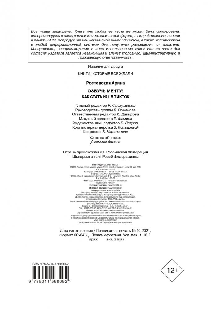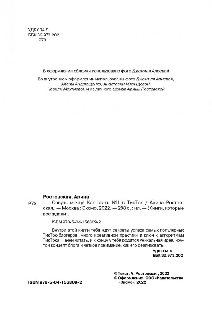 Привет! Хочешь регулярно попадать в рекомендации ТикТока? Собирать от 10 миллионов просмотров? Продвигать свой бренд и заставлять СМИ говорить о тебе? Превратить хобби в видео контент и покорить бурные «реки»? Я Арина Ростовская, ТикТок-блогер № 1 в России. И если ты держишь в руках мою книгу, у тебя есть возможность НАВСЕГДА изменить свою жизнь. Внутри тебя ждут секреты не только моего успеха, но и успеха других крупных блогеров, много креативной практики и ключ к алгоритмам ТикТока. Начни читать, и обещаю, к концу у тебя родится УНИКАЛЬНАЯ идея, крутой концепт блога и чёткое понимание, как его реализовать. Решайся!