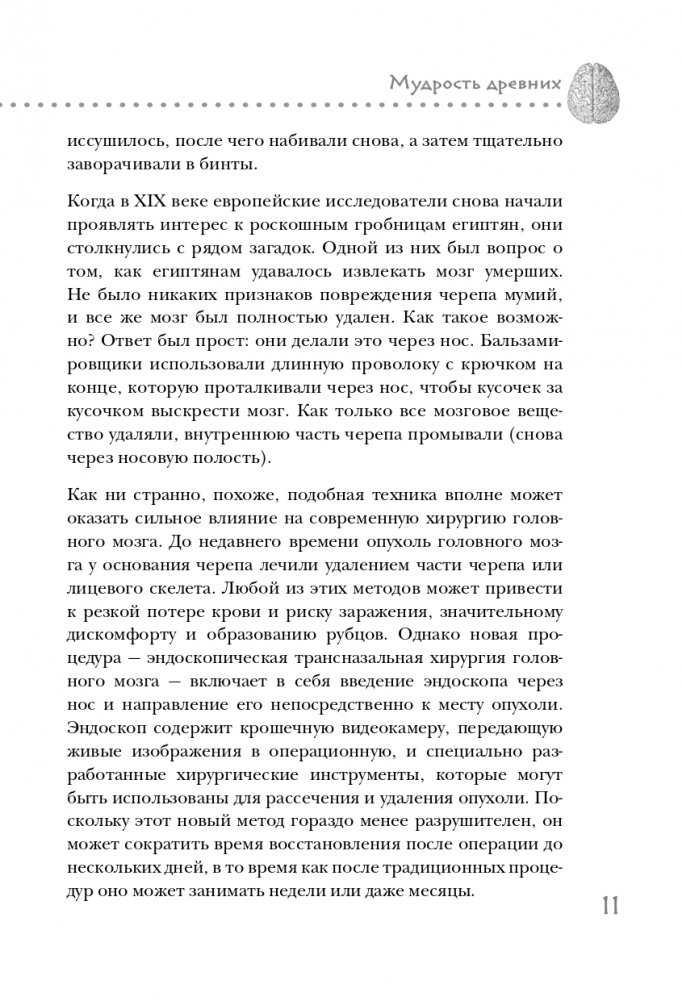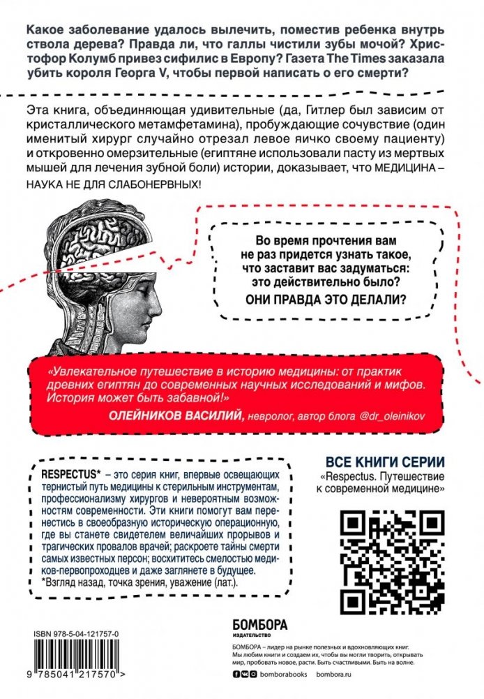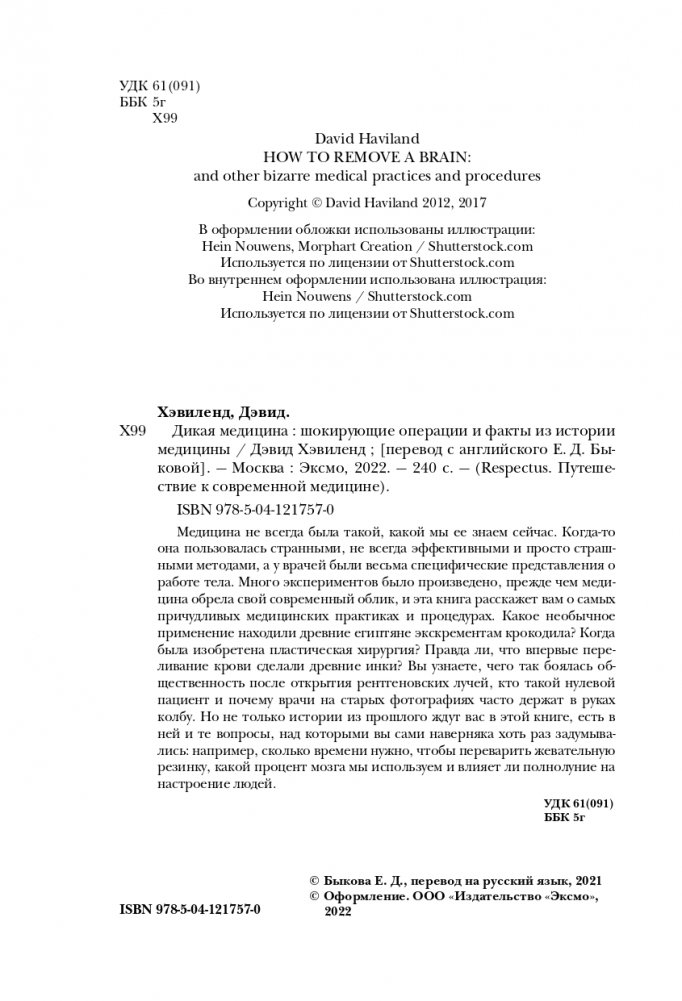 Медицина не всегда была такой, какой мы ее знаем сейчас. Когда-то она пользовалась странными, не всегда эффективными и просто страшными методами, а у врачей были весьма специфические представления о работе тела. Много экспериментов было произведено, прежде чем медицина обрела свой современный облик, и эта книга расскажет вам о самых причудливых медицинских практиках и процедурах. Какое необычное применение находили древние египтяне экскрементам крокодила? Когда была изобретена пластическая хирургия? Правда ли, что впервые переливание крови сделали древние инки? Вы узнаете, чего так боялась общественность после открытия рентгеновских лучей, кто такой нулевой пациент и почему врачи на старых фотографиях часто держат в руках колбу. Но не только истории из прошлого ждут вас в этой книге, есть в ней и те вопросы, над которыми вы сами наверняка хоть раз задумывались: например, сколько времени нужно, чтобы переварить жевательную резинку, какой процент мозга мы используем, и влияет ли полнолуние на настроение людей.