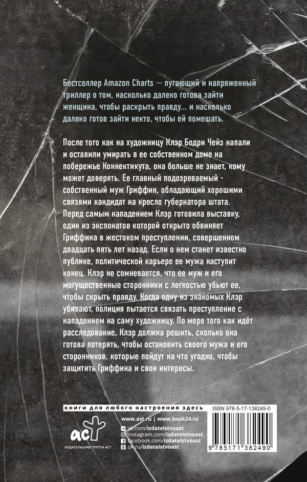 Бестселлер Amazon Charts — пугающий и напряжённый триллер о том, насколько далеко готова зайти женщина, чтобы раскрыть правду... и насколько далеко готов зайти некто, чтобы ей помешать. После того как на художницу Клэр Бодри Чейз напали и оставили умирать в её собственном доме на побережье Коннектикута, она больше не знает, кому может доверять. Её главный подозреваемый — собственный муж Гриффин, обладающий хорошими связями кандидат на кресло губернатора штата. Перед самым нападением Клэр готовила выставку, один из экспонатов которой открыто обвиняет Гриффина в жестоком преступлении, совершённом двадцать пять лет назад. Если о нём станет известно публике, политической карьере её мужа наступит конец. Клэр не сомневается, что её муж и его могущественные сторонники с лёгкостью убьют её, чтобы скрыть правду. Когда одну из знакомых Клэр убивают, полиция пытается связать преступление с нападением на саму художницу. По мере того как идёт расследование, Клэр должна решить, сколько она готова потерять, чтобы остановиться своего мужа и коррумпированную группу поддерживающих его людей, которые пойдут на что угодно, чтобы защитить Гриффина и свои интересы.