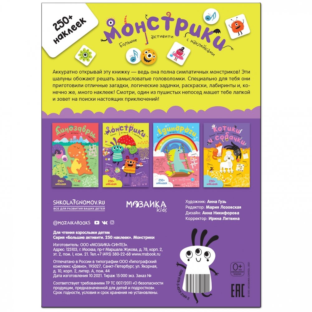 Книга «Монстрики» из серии «Большие активити. 250 наклеек» — настоящая находка! Тут есть все, что так обожают дети. Много-много наклеек: больше 250. Самые любимые герои — монстрики. И конечно, веселые развивающие задания. Стоит бросить вызов себе самому и найти выход из запутанного лабиринта, разгадать судоку, поломать голову над логическими задачками и поискать самые неожиданные отличия между картинками. С монстриками точно не заскучаешь! А еще такие занятия способствуют развитию логики, мышления, внимания, мелкой моторики, речи.