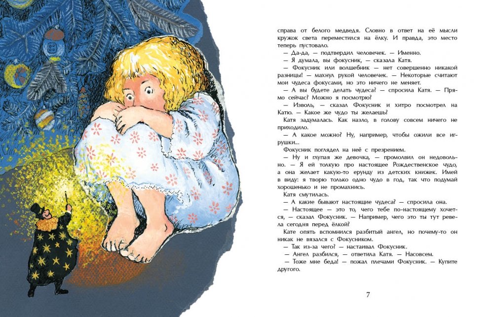 В Сочельник, как и положено в сказке, девочке Кате приходится пережить волшебное путешествие, пройти через испытания и опасности. Она оказывается среди библейских героев, там, где ждут рождения Младенца. И хотя украшавший ёлку старинный стеклянный ангел разбился, Катя, бережно сохранив белое пёрышко от его крыла, самоотверженно стремится сделать всё, чтобы не прерывалось вечное движение Рождественских событий.