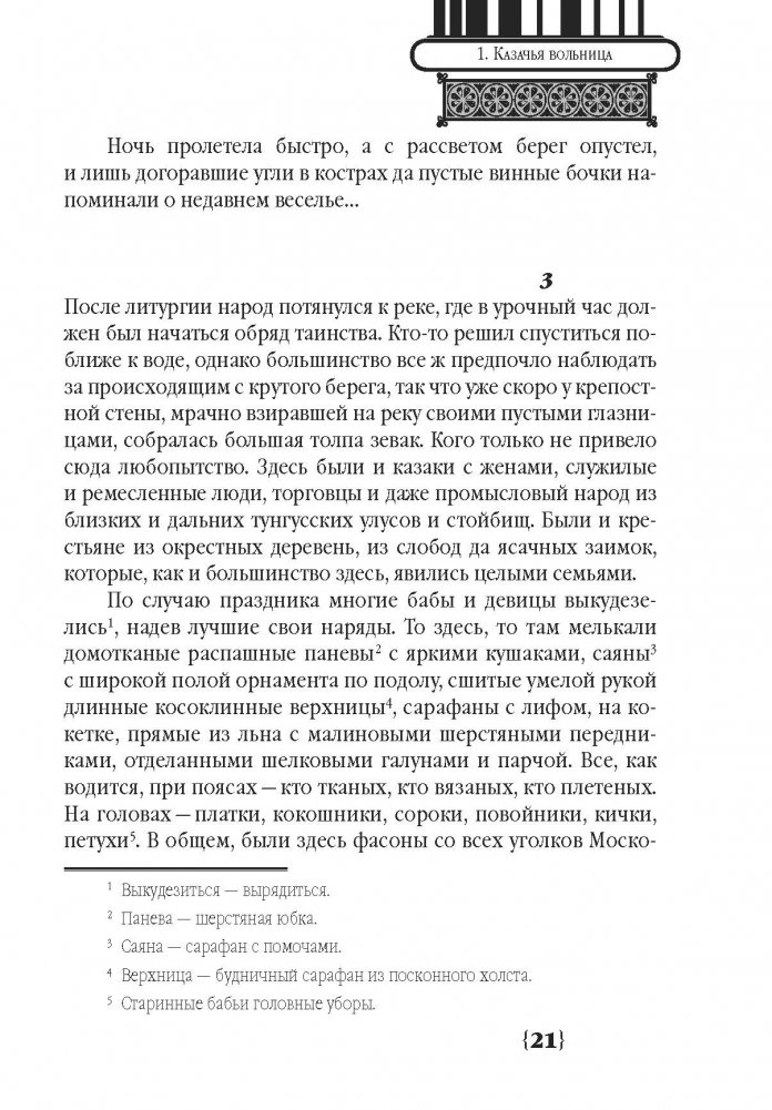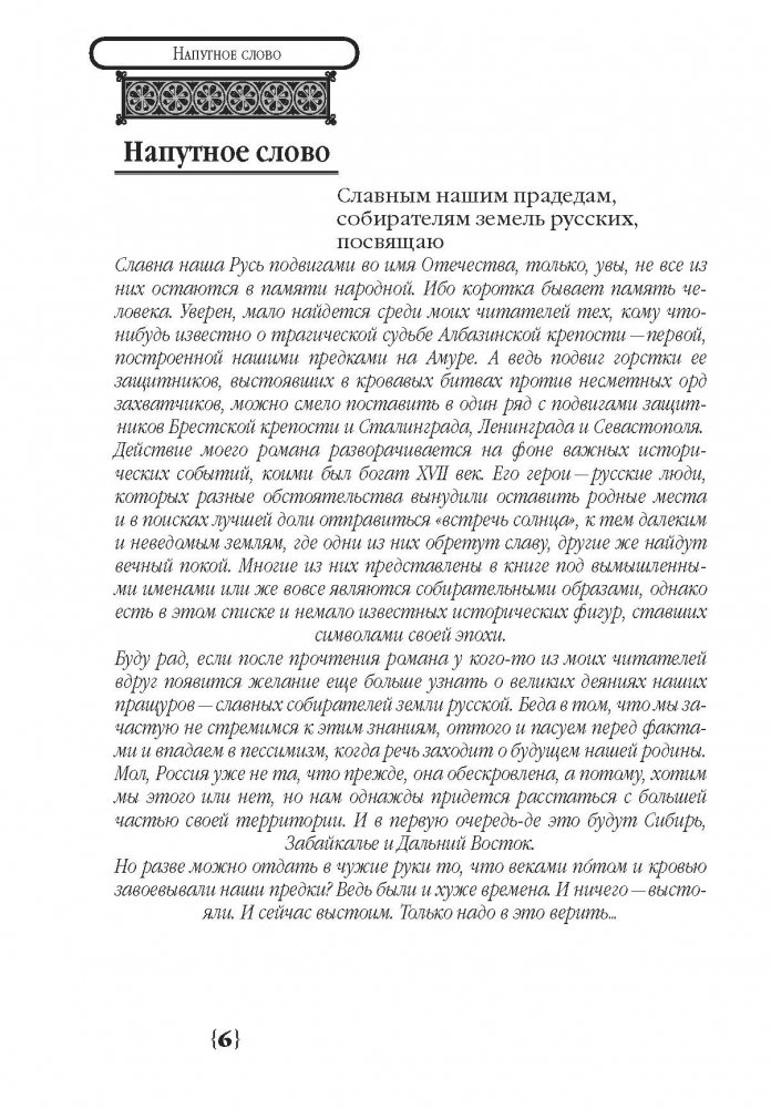 Захватывающий роман повествует о героической обороне первого русского укрепленного поселения на Амуре. Албазинский острог был основан в середине XVII века гонимыми на восток в поисках вольной жизни русскими людьми - беглыми казаками, среди которых были участники восстания Степана Разина, разного рода авантюристами, бедными земледельцами. Царские власти, дабы не портить отношений с соседним Китаем, тоже претендовавшим на эти земли, долгое время не признавали Албазин, однако его обитатели продолжали считать себя подданными России, отсылали в центр пушную дань и отважно обороняли крепость от многократно превосходящих сил грозного соседа. Увы, в 1689 году Московское государство и Цинская Империя заключили Нерчинский договор, по которому русские должны вынуждены были оставить приамурские земли...