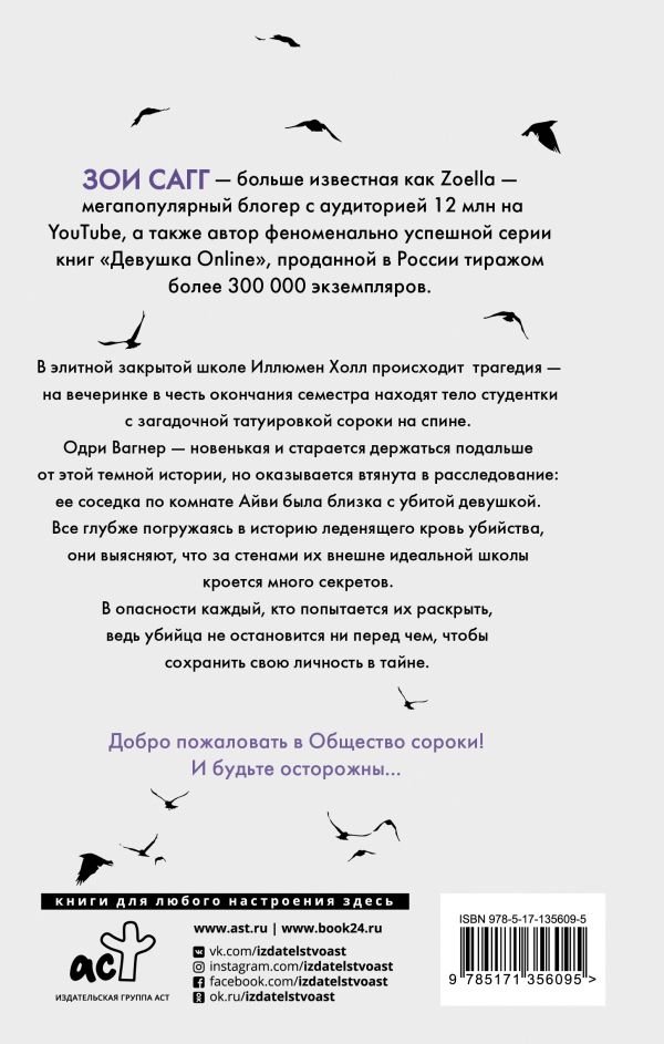 В элитной закрытой школе Иллюмен Холл случается трагедия — на вечеринке в честь окончания семестра находят тело студентки с загадочной татуировкой сороки на спине. Одри Вагнер — новенькая и старается держаться подальше от этой темной истории, но оказывается втянута в расследование: ее соседка по комнате Айви была близка с убитой девушкой. Все глубже погружаясь в историю леденящего кровь убийства, они выясняют, что за дверью их внешне идеальной школы кроется много секретов. В опасности каждый, кто сможет их раскрыть, ведь убийца не остановится ни перед чем, чтобы сохранить свою личность в тайне. Добро пожаловать в Общество сороки! И будьте осторожны...