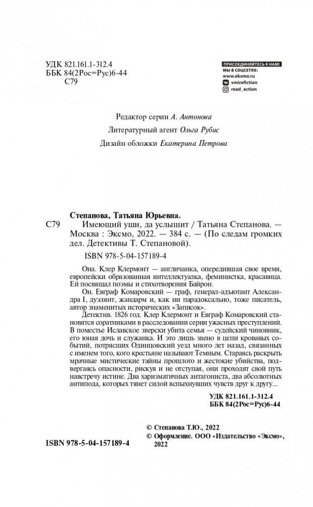 Она. Клер Клермонт – англичанка, опередившая свое время, европейски образованная интеллектуалка, феминистка, красавица. Ей посвящал поэмы и стихотворения Байрон. Он. Евграф Комаровский – граф, генерал-адъютант Александра I, дуэлянт, жандарм и, как ни парадоксально, тоже писатель, автор знаменитых исторических "Записок". Детектив. 1826 год. Клер Клермонт и Евграф Комаровский становятся соратниками в расследовании серии ужасных преступлений. В поместье Иславское зверски убита семья – судейский чиновник, его юная дочь и служанка. И это лишь звено в цепи кровавых событий, потрясших Одинцовский уезд много лет назад, связанных с именем того, кого крестьяне называют Темным. Стараясь раскрыть мрачные мистические тайны прошлого и жестокие убийства, подвергаясь опасности, рискуя и не отступая, они проходят свой путь навстречу истине. Два харизматичных антагониста, два абсолютных антипода, которых тянет силой вспыхнувших чувств друг к другу...