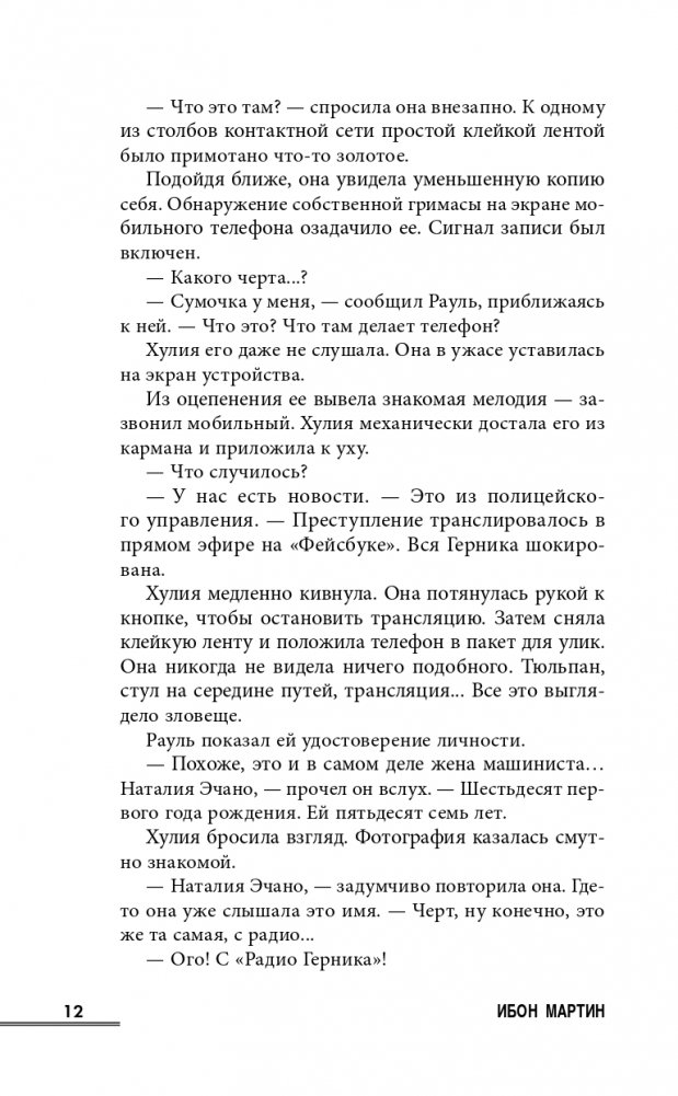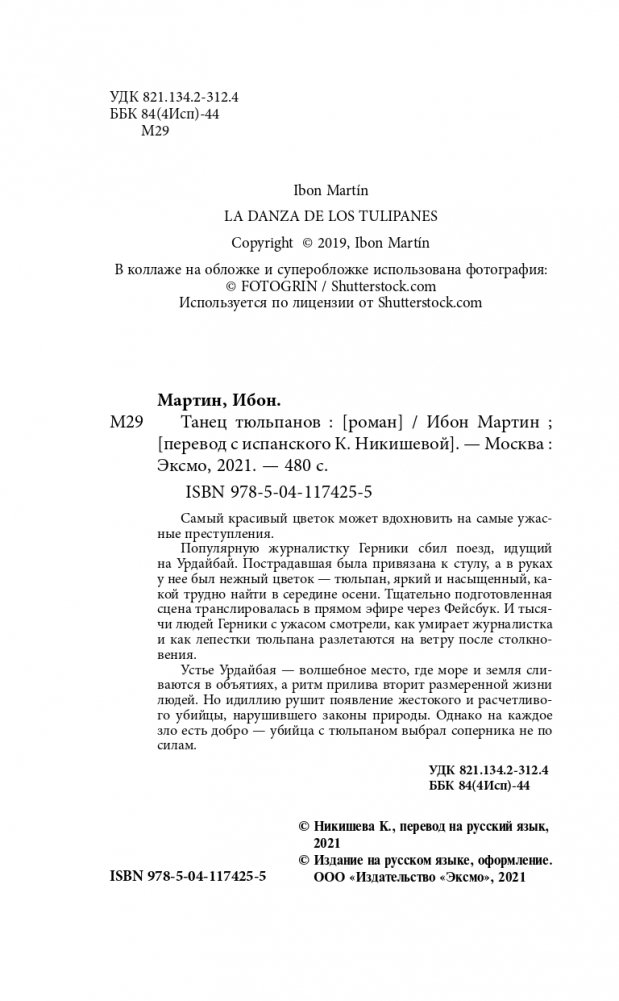 Невероятно нежный и в то же время жестокий триллер «Танец тюльпанов» получил множество восторженных отзывов на иностранных платформах и вошел в список бестселлеров Amazon в 2019 году. Алый тюльпан стал символом смерти. Это захватывающее путешествие по уютному региону Испании, на первый взгляд тихому и умиротворенному. Но все меняется после убийства популярной журналистки, которое транслировалось в прямом эфире через Фэйсбук. Она стала первой жертвой в руках с алым, как кровь, тюльпаном, но не последней. Мирное время сменилось бушующим страхом. Полиции придется «заглянуть» в прошлое, разгадать мотивы и найти знаменитого Убийцу с тюльпаном. «Ибон Мартин создал жестокий и нежный триллер, подобный тюльпанам, которыми убийца украшает своих жертв… Превосходный роман». – Доминго Вильяр «Танец тюльпанов» - головокружительное криминальное путешествие, это напряженное время, в течение которого мы узнаем об окружающей среде и психологии человека. С яркими конкретными моментами, такими как прогулка по рынку или разговоры в баре, среди бесчисленного множества других: серфинг, монастырь, музыкальное представление, семейная конфронтация ... и это не значит, что эти места существуют для того, чтобы что-то происходило – что-то происходит, потому что эти места просто существуют [...] Портреты персонажей и обстановка находятся в гармонии так, чтобы ничего не резало глаз и читатель мог полностью погрузиться в историю, забывая, что впереди грандиозный финал. Это замечательно». – Хорди Валеро, Interrobang