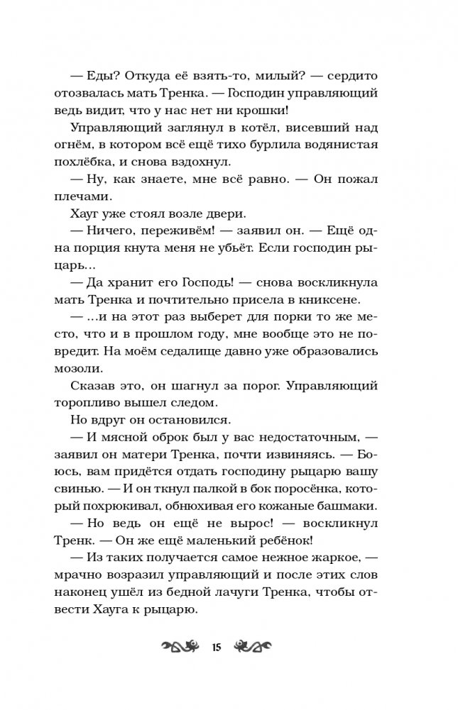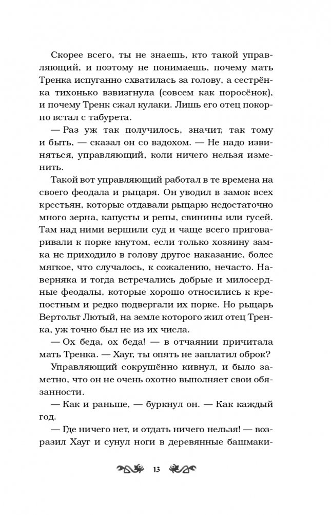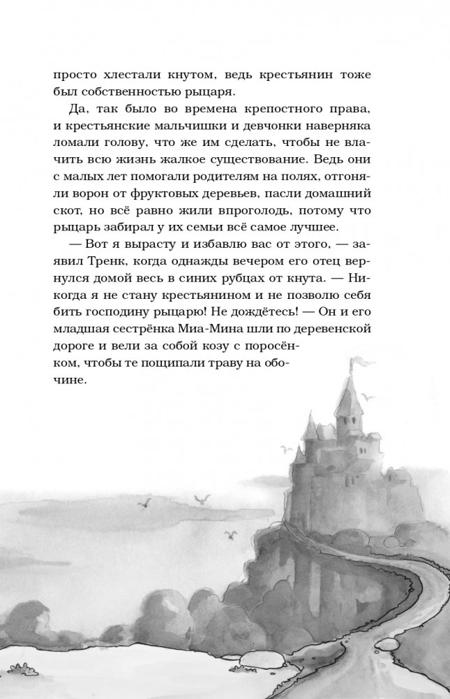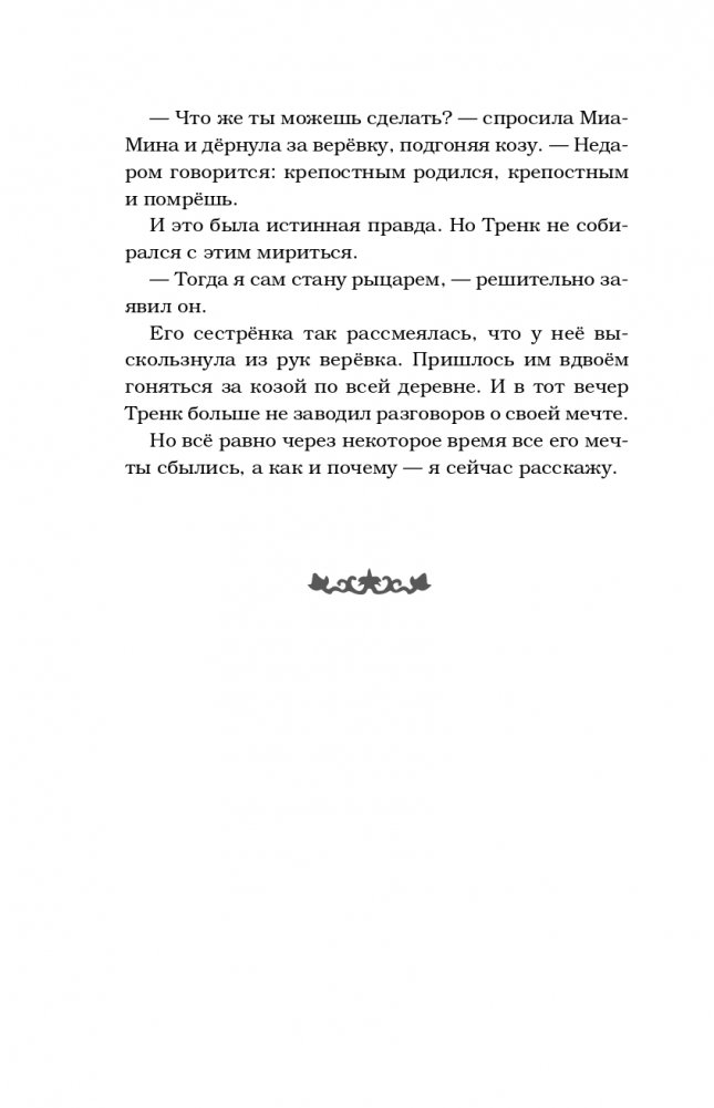 Давным-давно, когда Америку ещё не открыли, а в лесах путников подстерегали разбойники и драконы, жил-был мальчик по имени Тренк. Он родился в семье бедного крепостного крестьянина, и хозяином их был злой рыцарь по прозвищу Вертольд Лютый. Но однажды Тренк решил изменить свою судьбу — и стать рыцарем сам! Только не плохим, а хорошим. Это, конечно, было непросто. Но ему помогли храбрость, доброе сердце, находчивость и немножко удачи. Хочешь узнать, как Тренк осуществил свою мечту? Автор этой книги Кирстен Бойе — всемирно известная немецкая писательница, классик современной детской литературы. Её книги удостоены множества наград (в том числе, премии ЮНЕСКО и Немецкой молодёжной литературной премии) и переведены на множество языков. По ним снимают фильмы и мультсериалы. Издание отличает удобный для чтения шрифт — и множество обаятельных чёрно-белых иллюстраций. Отличный вариант как для самостоятельного чтения, так и для чтения всей семьёй! Книга будет интересна мальчикам и девочкам 6—9 лет.