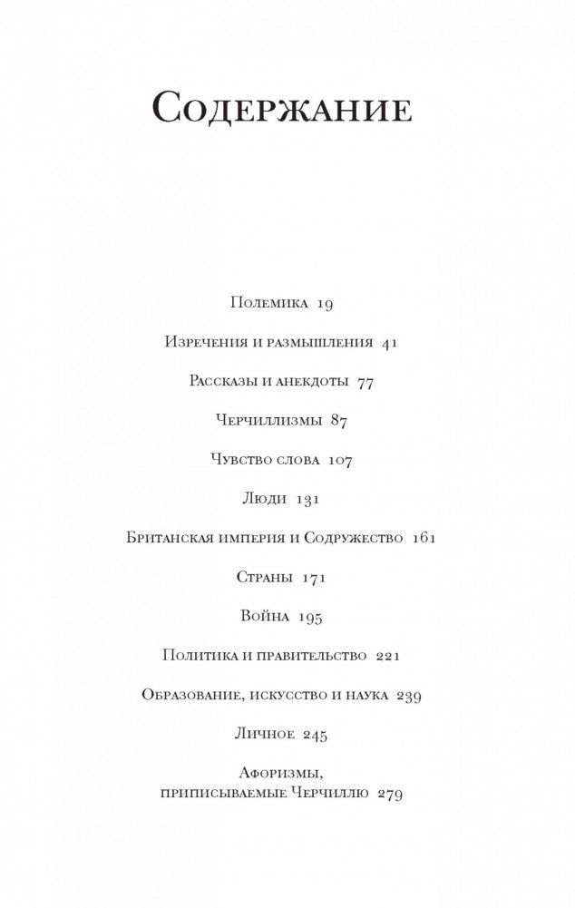 В эту книгу вошли не только широко известные изречения Уинстона Черчилля, но и его небольшие философские притчи, а также полная сарказма полемика с политическими деятелями его времени. Большой интерес для читателей представляет раздел, где собраны афоризмы, приписываемые Черчиллю, — как, например, переходящая из уст в уста знаменитая фраза «…демократия — худшая форма правления, если не считать всех остальных, к которым до сих пор прибегало человечество».