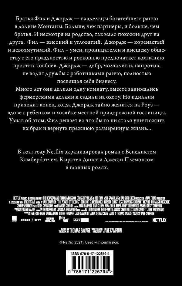 «Власть пса» Томаса Сэвиджа — мрачная и поэтическая история о жизни маленького городка на американском западе в двадцатых годах прошлого столетия. В декабре 2021 года на сервисе Netflix состоялась премьера одноимённой экранизации с Бенедиктом Камбербэтчем и Кирстен Данст в главных ролях. Братья Фил и Джордж владеют крупнейшим ранчо в долине Монтаны. Несмотря на родство, они очень разные. Один умный и проницательный и предпочитает водить компанию с простыми ковбоями. Второй добрый и молчаливый и полностью посвящает себя бизнесу. Долгие годы они жили вдвоём, а затем Джордж тайком женится на местной вдове, хозяйке придорожной гостиницы. Узнав об этом, Фил решает пойти на всё, лишь бы разрушить их брак и вернуть прежнюю размеренную жизнь.