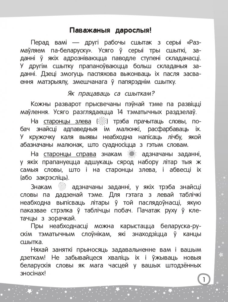 У серыю «Размаўляем па-беларуску» ўваходзіць 3 розныя па ўзроўню складанасці сшыткі. Гэта другі, больш складаны ўзровень. Змешчаны тут матэрыял ахоплівае 14 тэм па развіцці маўлення. З дапамогай сшытка маленькія вучні будуць развіваць увагу, лагічнае мысленне, чытацкія кампетэнцыі, а таксама замацоўваць веды па асноўных раздзелах маўлення. Выданне адрасуецца вучням пачатковых класаў, але можа быць цікавым і для дзяцей дашкольнага ўзросту.