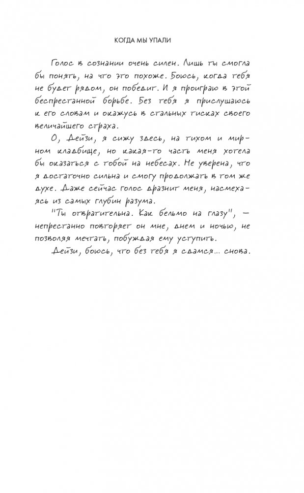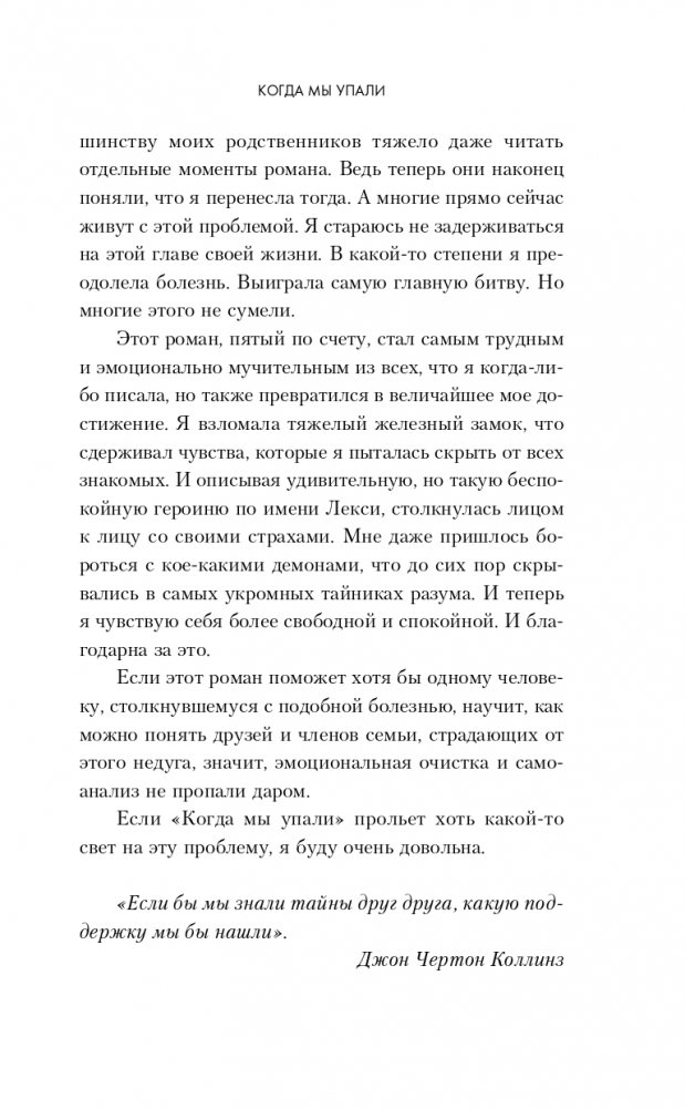 Тилли Коул — автор, чьи строки влюбляют в себя с первых страниц. Ее романы в России были проданы тиражом свыше 102 тыс. экземпляров! Светлые, искренние, трогательные и глубокие книги Коул оставят неизгладимый след в вашем сердце. «Когда мы упали» — это роман-исповедь. Рассказывая историю Лекси, Тилли Коул делится своим уникальным опытом борьбы с анорексией, привычками и переживаниями, которые сопровождают на протяжении этого пути. Анорексия — огромная проблема для многих девушек, которая тесно вплелась в нашу жизнь, но ее редко обсуждают вслух. Тилли взяла на себя смелость открыто рассказать об этом читателю и напомнить, что тревоги и неуверенность в себе — это не повод изводить себя. Человеку, страдающему от анорексии, необычайно важны ваша поддержка и помощь. Роман убеждает в том, что в жизни не бывает черного и белого, хорошего и плохого. Так и Лекси с Остином — две израненные души, которые не намерены сдаваться. Девушка со сломленной душой и неверием в себя, парень, вынужденный сойтись с преступниками, чтобы помочь своей семье — смогут ли они найти счастье друг рядом с другом? «Невероятная история любви. Я плакала, сочувствовала, злилась, переживала. Я счастлива. Эмоции переполняют мое сердце. Порекомендую ли я эту книгу? Тысячу раз да!» — Goodreads.com