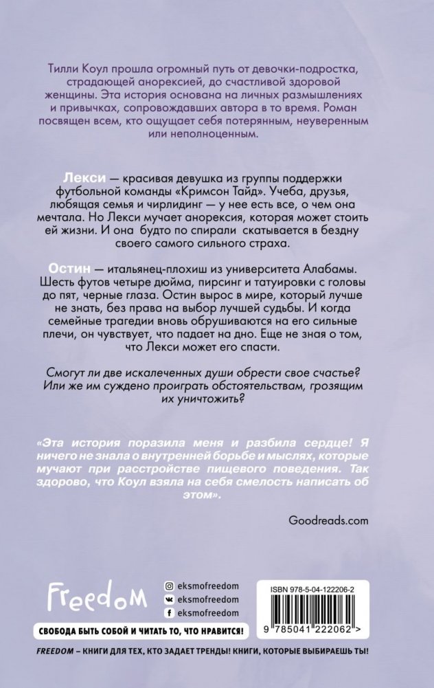 Лекси – красивая девушка из группы поддержки футбольной команды "Кримсон Тайд". Учеба, друзья, любящая семья и чирлидинг – у нее есть все, о чем она мечтала. Но Лекси мучает анорексия, которая может стоить ей жизни. И она, будто по спирали, скатывается в бездну своего самого сильного страха. Остин – итальянец-плохиш из университета Алабамы. Шесть футов четыре дюйма, пирсинг и татуировки с головы до пят, черные глаза. Остин вырос в мире, который лучше не знать, без права на выбор лучшей судьбы. И когда семейные трагедии вновь обрушиваются на его сильные плечи, он чувствует, что падает на дно. Еще не зная о том, что Лекси может его спасти. Смогут ли две искалеченные души обрести свое счастье? Или же им суждено проиграть обстоятельствам, грозящим их уничтожить?
