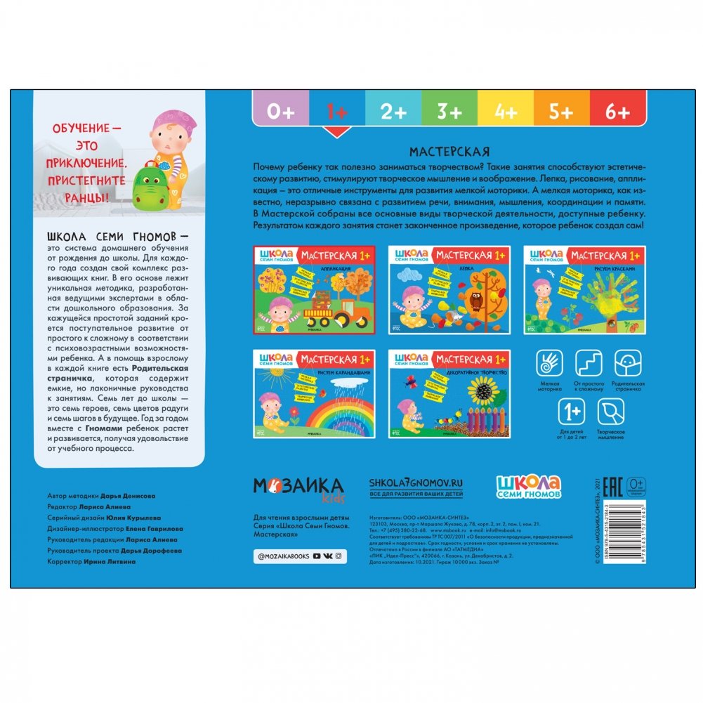 Книга «Аппликация 1+» из серии «Школа Семи Гномов. Мастерская» — это красочный альбом для занятий аппликацией с ребенком от 1 года до 2 лет. Занятия на близкие и понятные ребенку темы расположены по мере усложнения: поступательно переходя от освоения простых навыков к более сложным заданиям, ребенок научится создавать аппликацию с помощью бумаги и клея.