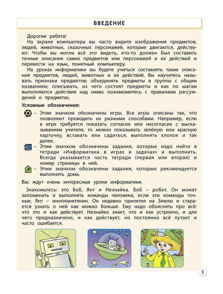 Учебник «Информатика» (авторы А.В. Горячев, Н.И. Суворова) предназначен для учащихся 3 класса общеобразовательных организаций. Соответствует Федеральному государственному образовательному стандарту начального общего образования. Является продолжением непрерывного курса информатики и составной частью комплекта учебников развивающей Образовательной системы «Школа 2100». Для проведения занятий компьютеры не требуются. В качестве рабочей тетради к учебнику используется учебное пособие «Информатика в играх и задачах». Курс может быть дополнен серией справочников-практикумов, которые помогут школьникам освоить отдельные компьютерные программы.