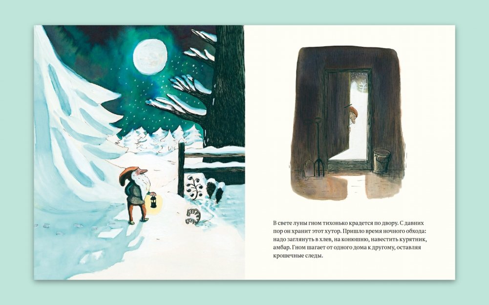 На дворе глубокая ночь. Где-то в лесной чаще под покровом снега уснул старый хутор и все его обитатели. Не спит лишь маленький гном. В свете луны он тихонько крадется по двору. Пришло время ночного обхода: надо заглянуть в хлев, на конюшню, навестить курятник, амбар.