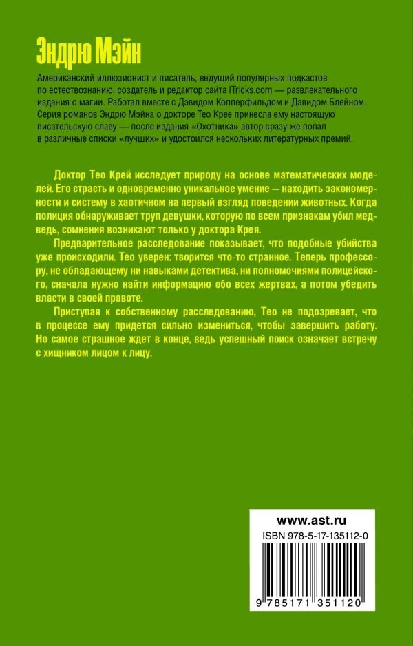 Доктор Тео Крей исследует природу на основе математических моделей. Его страсть и одновременно уникальное умение — находить закономерности и систему в хаотичном на первый взгляд поведении животных. Когда полиция обнаруживает труп девушки, которую по всем признакам убил медведь, сомнения возникают только у доктора Крея.