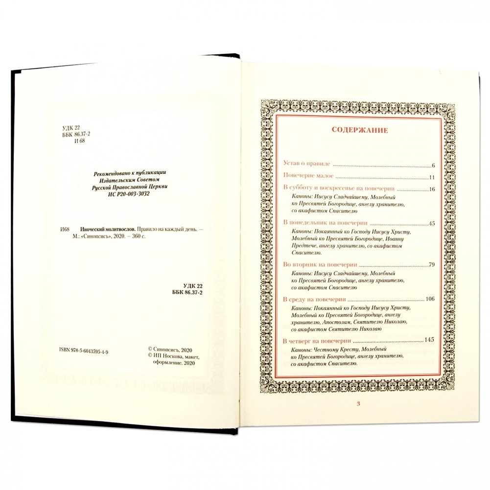 Иноческий молитвослов, напечатанный в два цвета гражданским шрифтом, содержит каноны на каждый день недели в соответствии с богослужебным уставом Православной Церкви. Помимо традиционных молитвословий, в издание включены части суточного круга богослужения, а также молитвы постной и цветной Триодей.