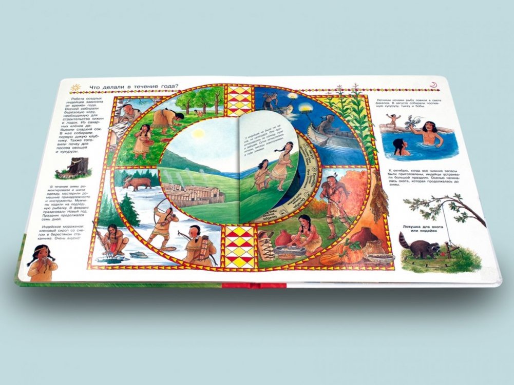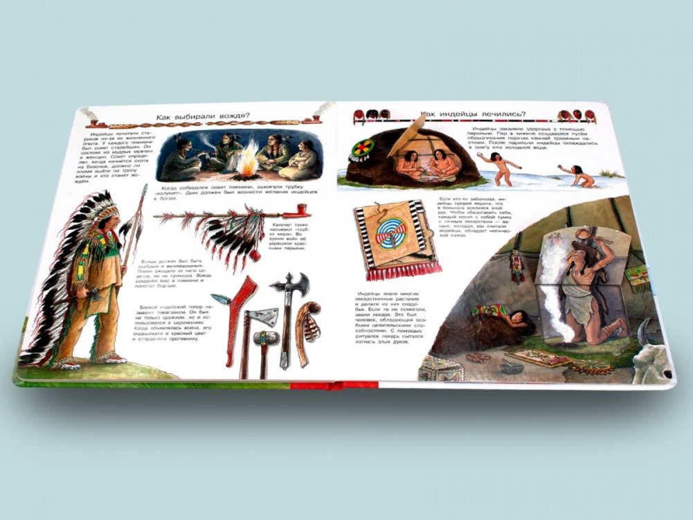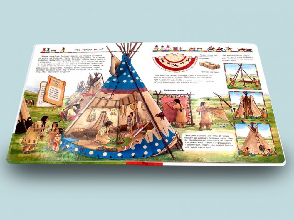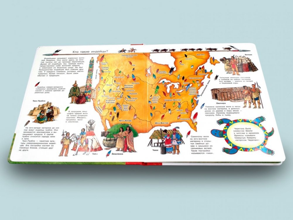 Книга увеличенного формата напечатана на высококачественном ламинированном картоне повышенной прочности с закруглёнными краями страниц. Каждый разворот энциклопедии насыщен массой увлекательной информации, описывающей жизнь и быт индейцев.
