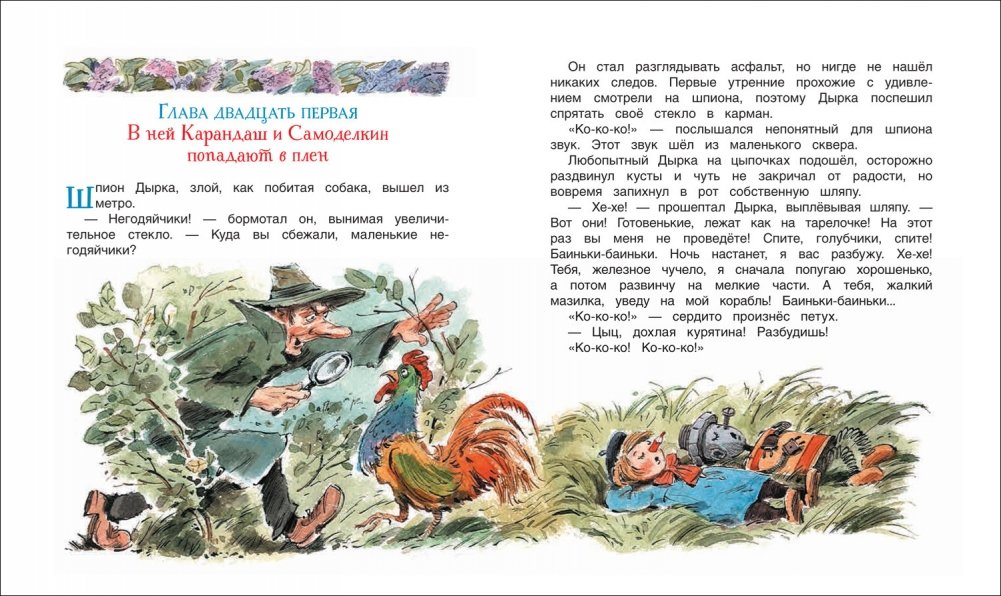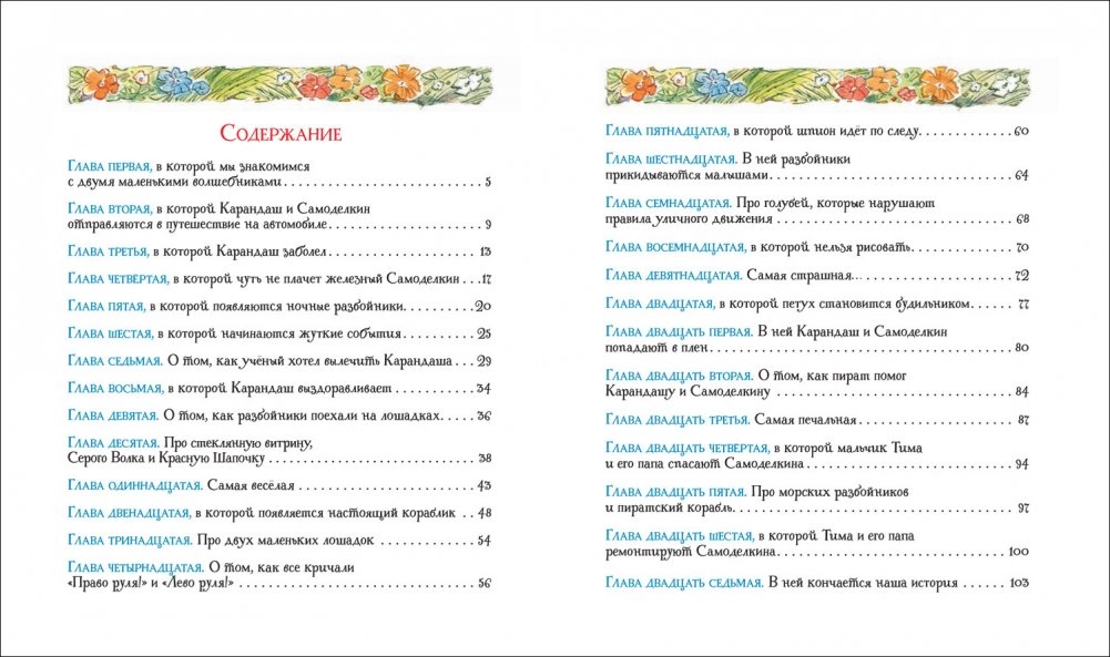 Книга расскажет о невероятных приключениях двух маленьких человечков — художника Карандаша и мастера Самоделкина. Вместе они сбегают из магазина игрушек, путешествуют на нарисованном автомобиле, строят дом, спускаются в ночное метро и побеждают злых разбойников.