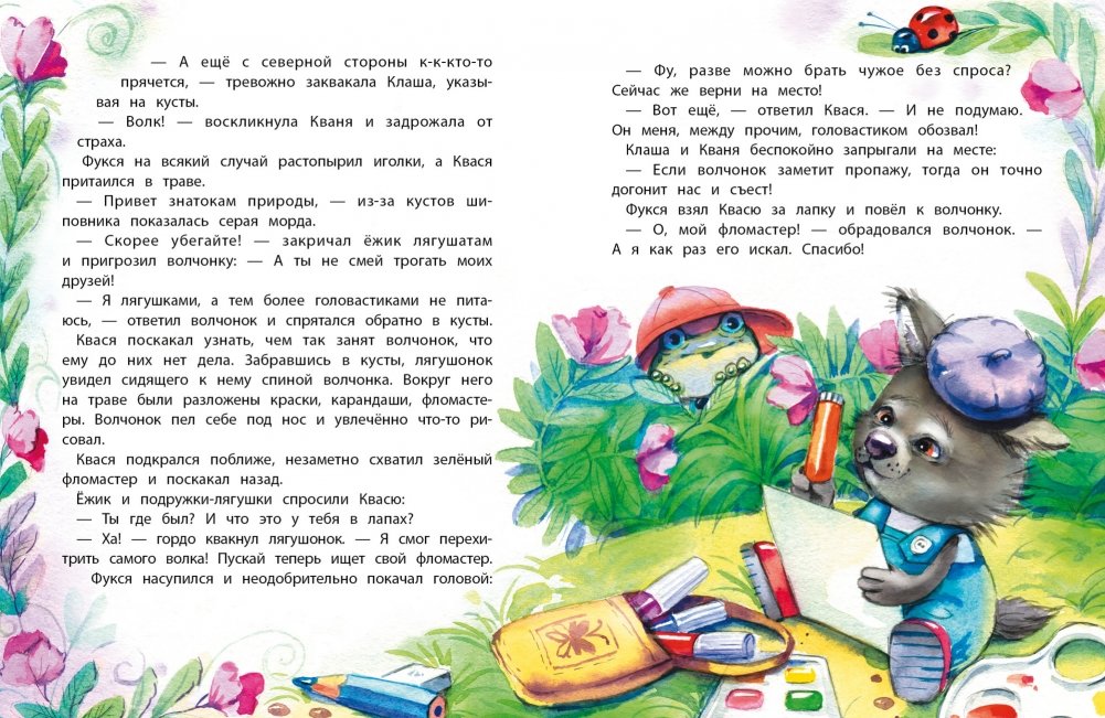 Лягушонок Квася задира и забияка. Он постоянно обижает маленьких и ссорится с девочками! Его любимая присказка: "Попробуй, догони! Попробуй, отбери!". А еще он ужасно не любит ни с кем делиться. Поэтому у Кваси нет друзей. Неужели лягушонок так и не поймет, что играть в мяч интереснее всем вместе, ягоды есть вкуснее, если их не прятать за спиной, а делать добрые дела гораздо приятнее, чем вредничать? Читайте и узнаете.